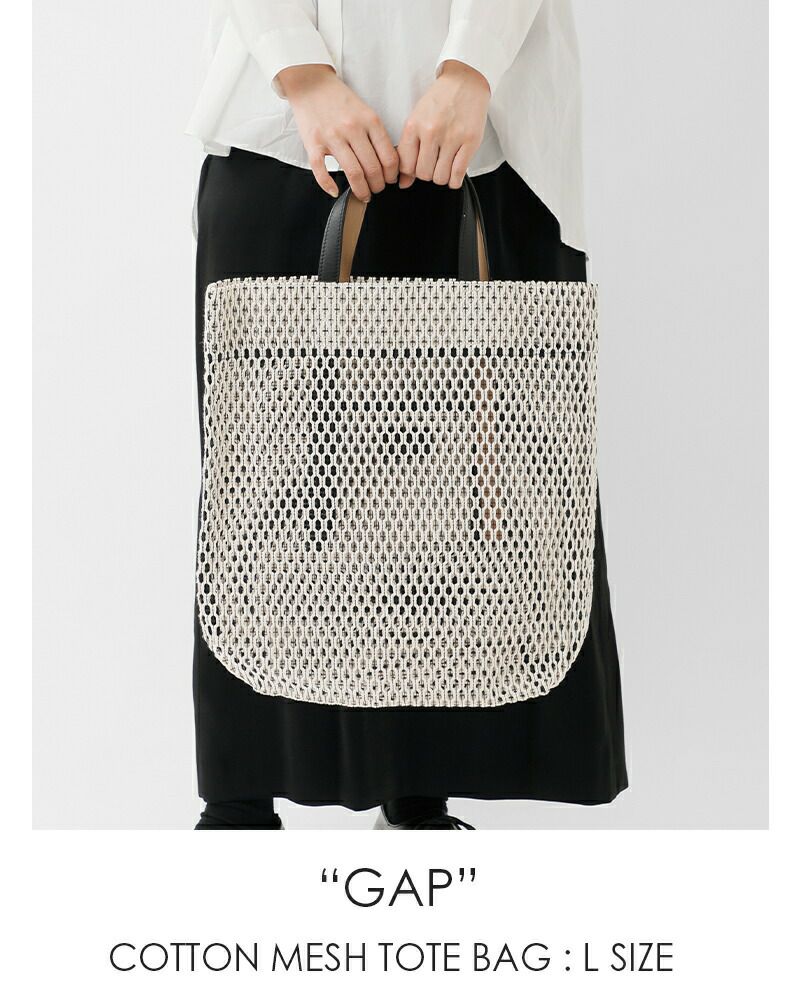 MARY AL TERNA(メアリオルターナ)より、コットン メッシュ トートバッグ L GAPのご紹介です。たっぷりと収納できる大型サイズの使いやすいトートバッグです。通気性に優れたメッシュ生地を使用しており、程よいハリ感がカジュアル過ぎず上品な印象を演出。カジュアルにもきれいめにも合わせやすいデザインと素材感のバッグです。