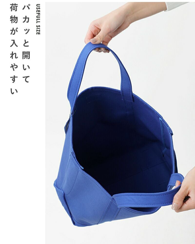 雑誌を横にして収納できる幅広サイズ。日帰り旅行やマルシェバッグとして使うのに調度いいサイズです。フロントに文庫本が入るサイズの小物ポケットあしらわれており、スマートフォンなどさっと取り出せて便利です。