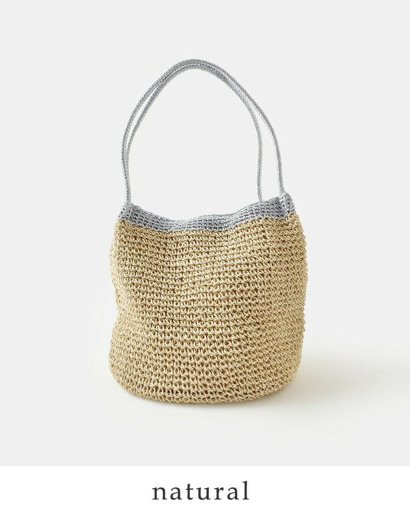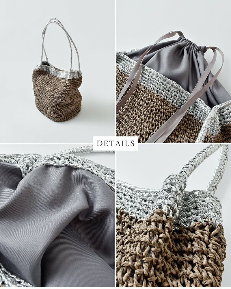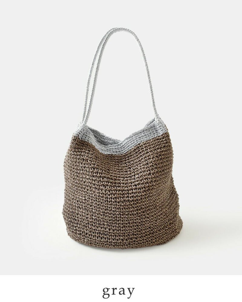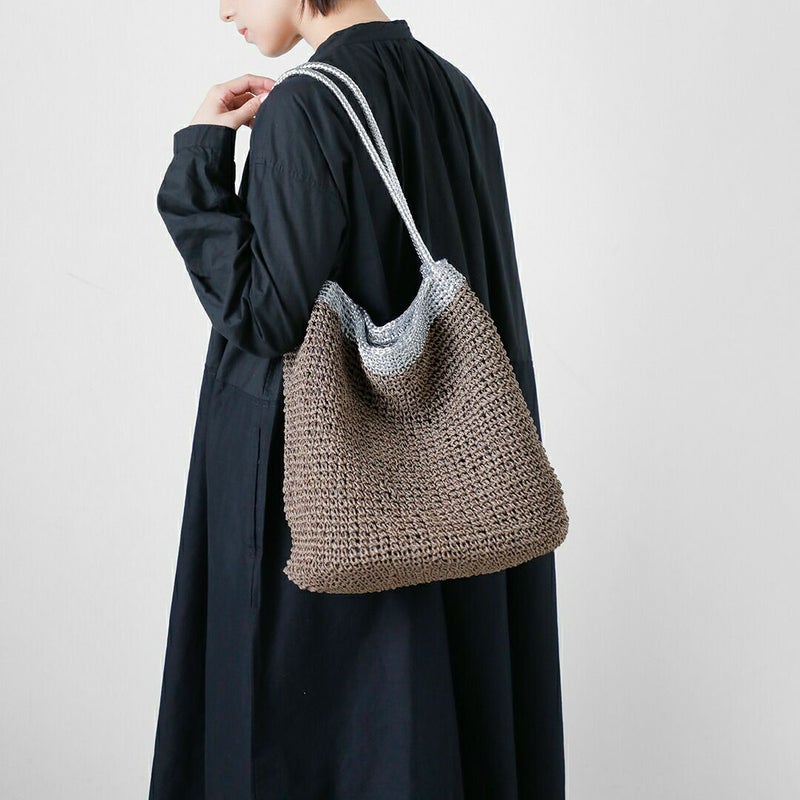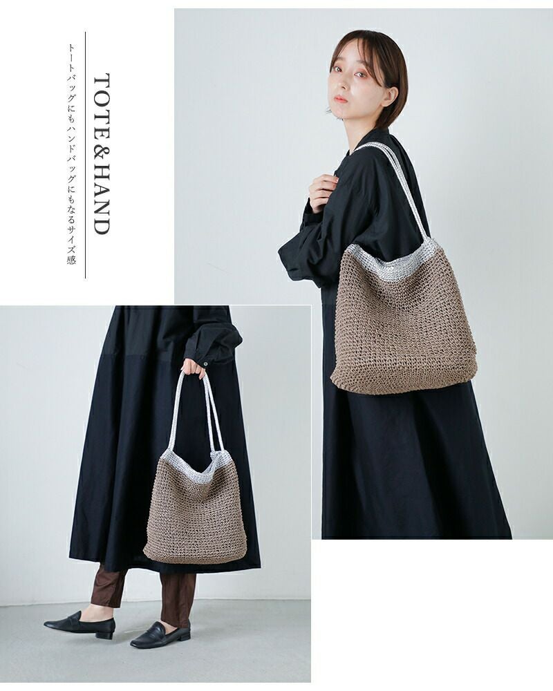ペーパー素材特有の軽やかでナチュラルな風合いに、メタリック糸の繊細な輝きが加わることで、カジュアルになりすぎず洗練された印象に仕上がっています。