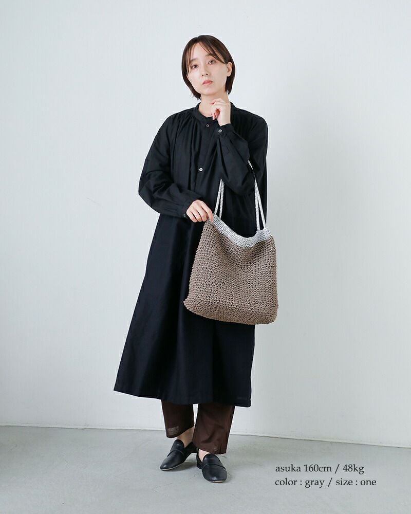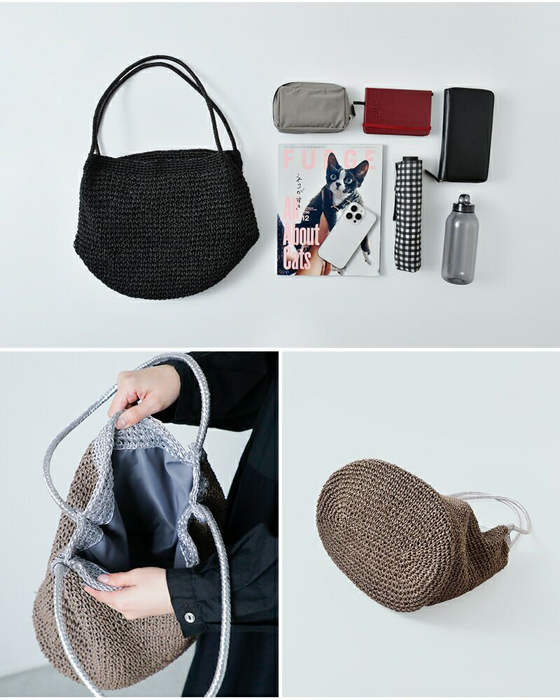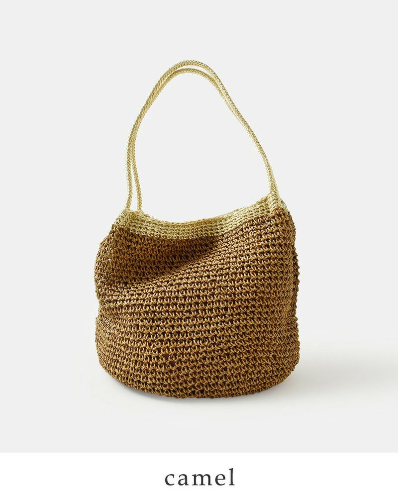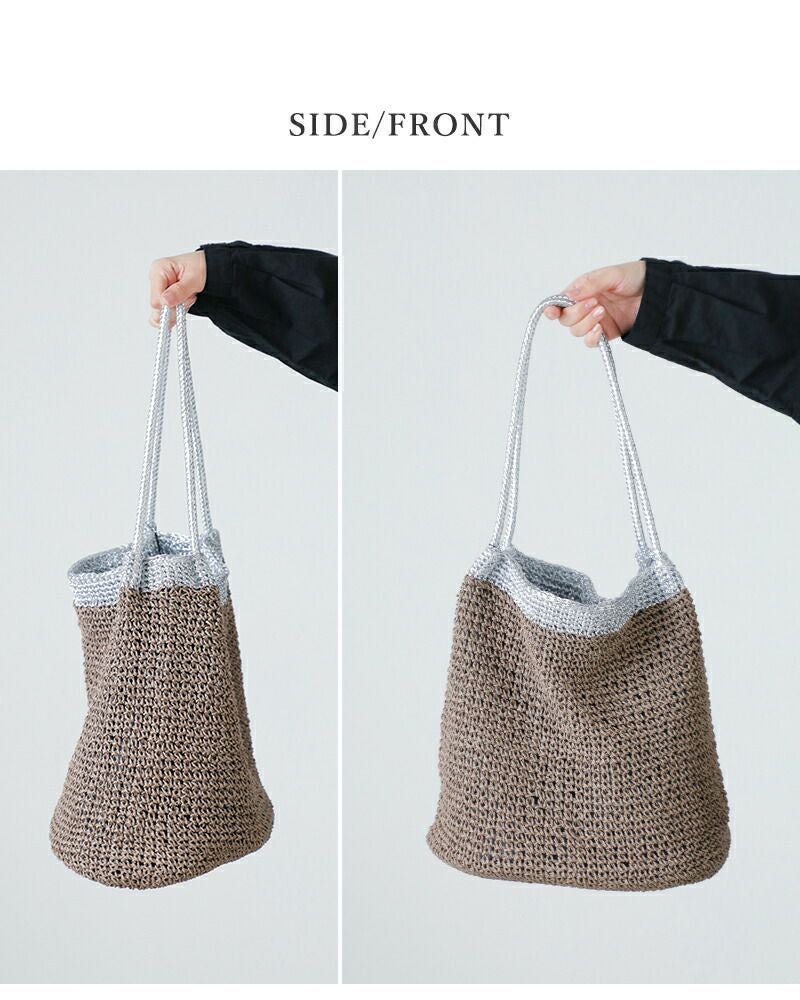 ペーパー素材特有の軽やかでナチュラルな風合いに、メタリック糸の繊細な輝きが加わることで、カジュアルになりすぎず洗練された印象に仕上がっています。