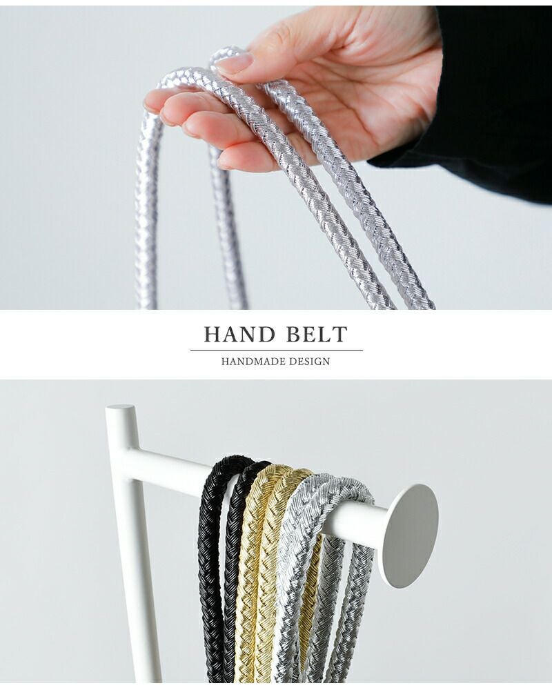 メタリック糸を丁寧に編み込んだハンドベルトは、手仕事ならではの立体感と奥行きのある表情が魅力です。