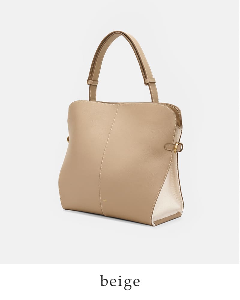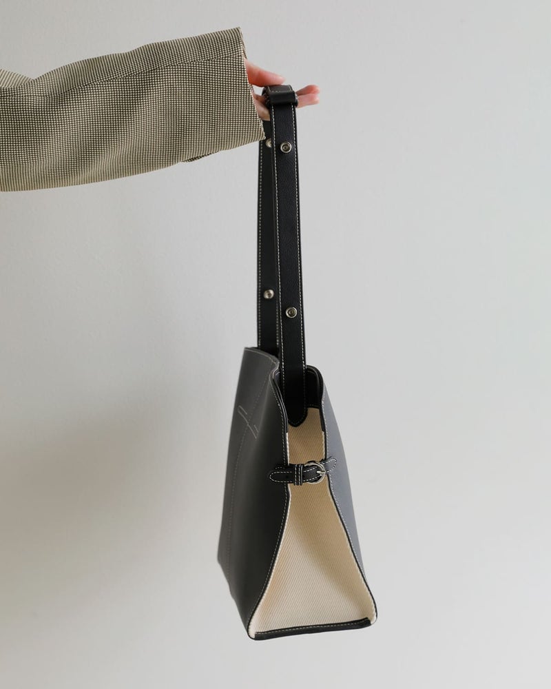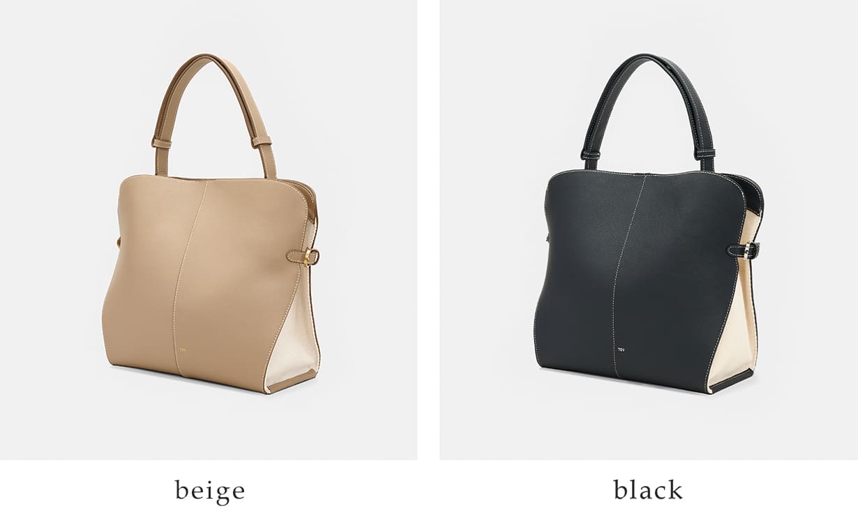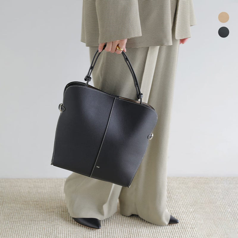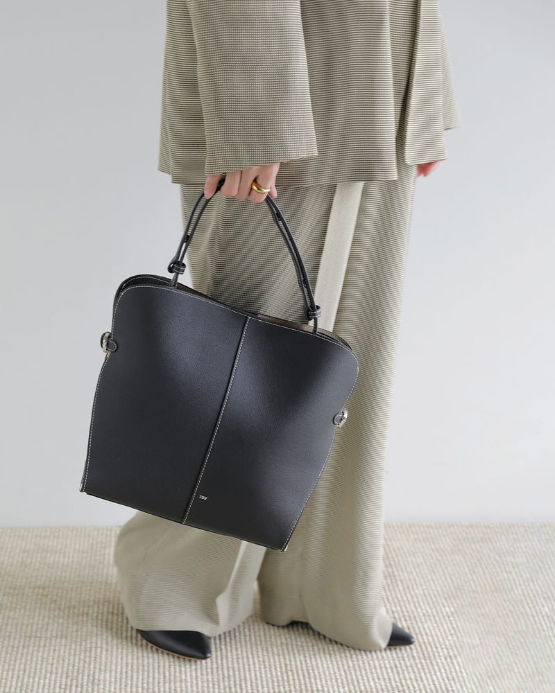 サイドのバックルによってフォルムを繋ぎ止める構造が特徴で、シンプルな中にも計算されたシルエットを生み出しています。開口部はマグネットボタン仕様で、スムーズな開閉が可能。インナーポケットも備え、使い勝手にも配慮されています。ハンドルはスナップボタンで調節でき、手持ちから肩掛けまでスタイルに合わせて柔軟に対応。