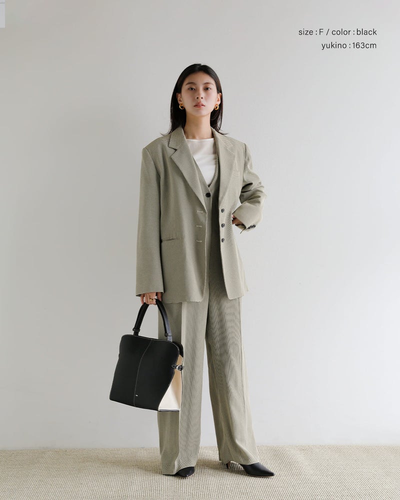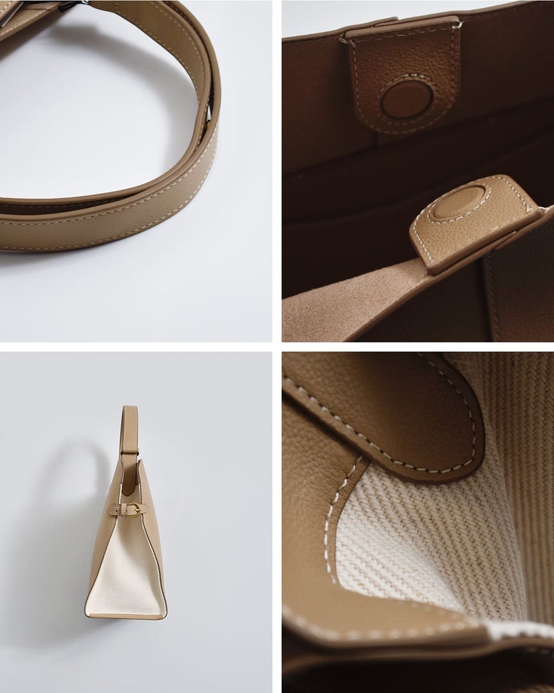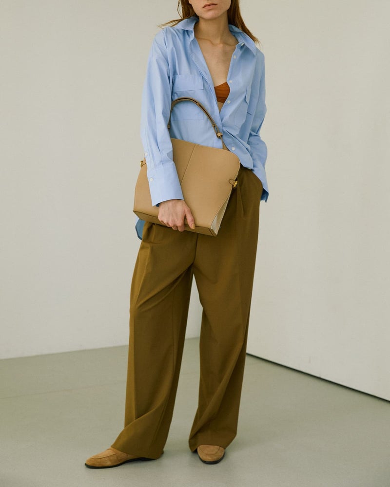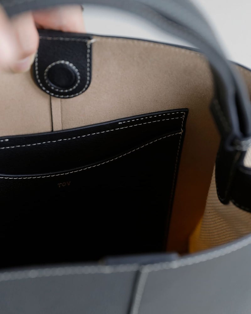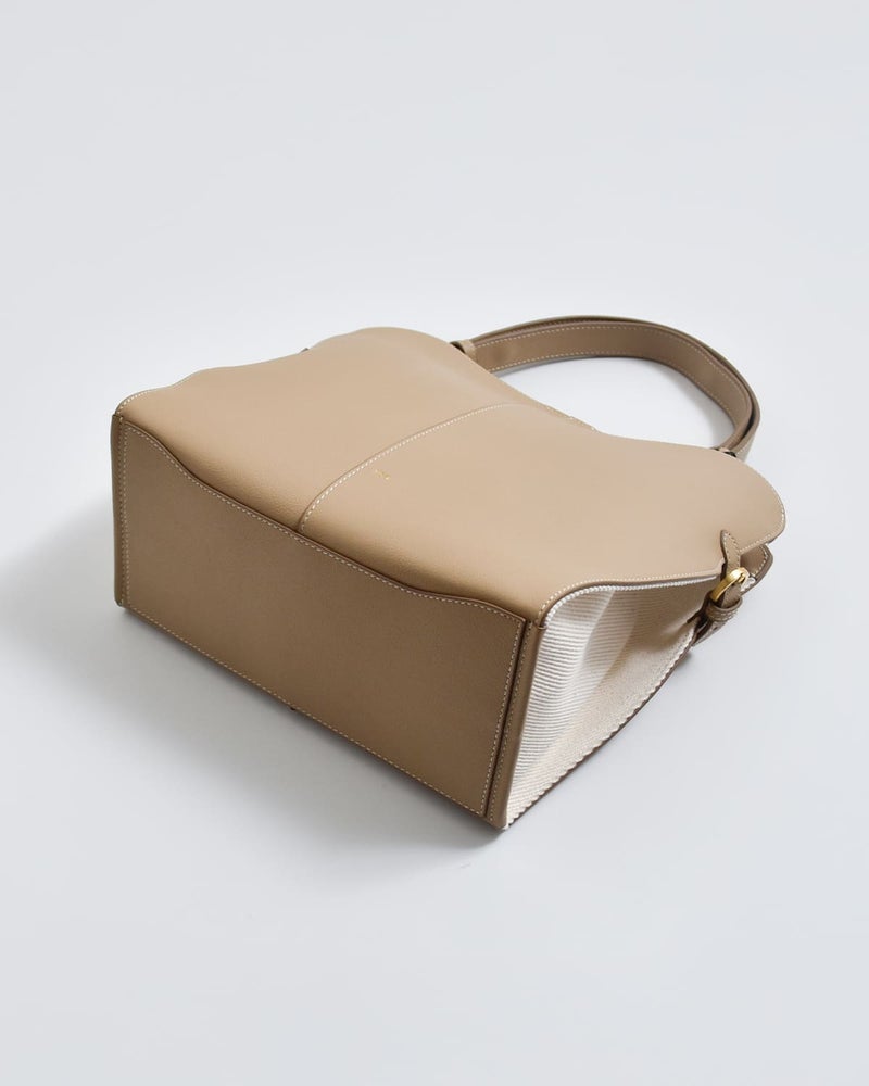 サイドのバックルによってフォルムを繋ぎ止める構造が特徴で、シンプルな中にも計算されたシルエットを生み出しています。開口部はマグネットボタン仕様で、スムーズな開閉が可能。インナーポケットも備え、使い勝手にも配慮されています。ハンドルはスナップボタンで調節でき、手持ちから肩掛けまでスタイルに合わせて柔軟に対応。