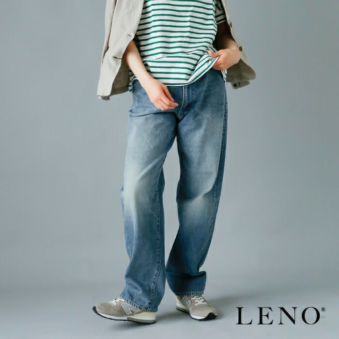 LENOのジーンズは旧式力織機(シャトル織機)によって織られています。旧式の織機では、現在主流の高速織機の6分の1のスピードで縦糸に無駄な力を加えず織ることで、生地の表面が凸凹とした風合いのある生地になります。これが着用を繰り返す事で奥行きのある美しいフェードを生み出します。更に横糸のテンションを調節することにより、厚みがあっても柔らかい風合いになるよう調節をしています。生地の 表情は昔ながらの荒々しさを残しつつ、女性でもストレスを感じずに着られる生地となります。