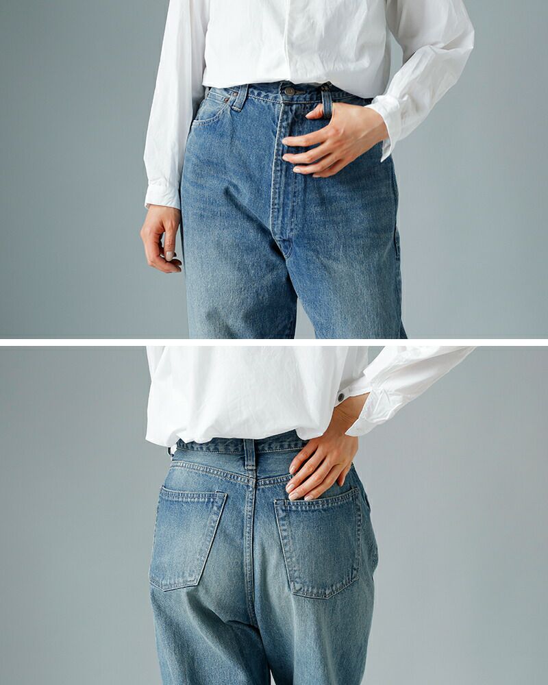 ハイウエストのワイドシルエットはどこか古き良き雰囲気をもちつつ、現代の着こなしにも合わせやすい女性らしい形。永年履き込んだような、自然な色落ちのヴィンテージ加工を施しています。濃淡の差を抑えた、品のある色落ち感もポイント。通年着られる淡いブルーのジーンズは、カジュアルなコーディネートの定番です。きれいめのトップスにも好相性です。