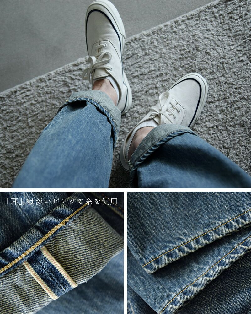 現存するヴィンテージを元に、1年以上をかけてデニムの耳までを研究し忠実に再現したオリジナルデニム。12ozと、厚過ぎず薄過ぎないベーシックな生地厚になります。太めのシルエットで脚にまとわりつかず、夏場でも快適に穿いていただけます。セルビッチ仕様になっているのでロールアップし、短い靴と合わせる着こなしもオススメです。