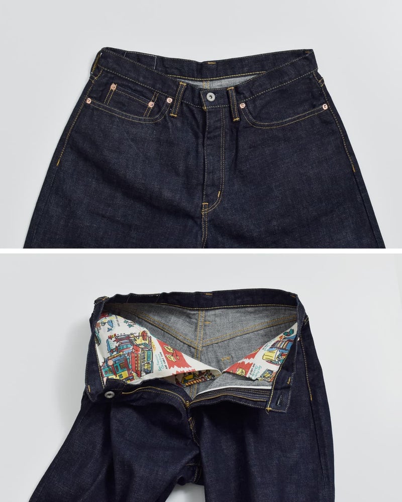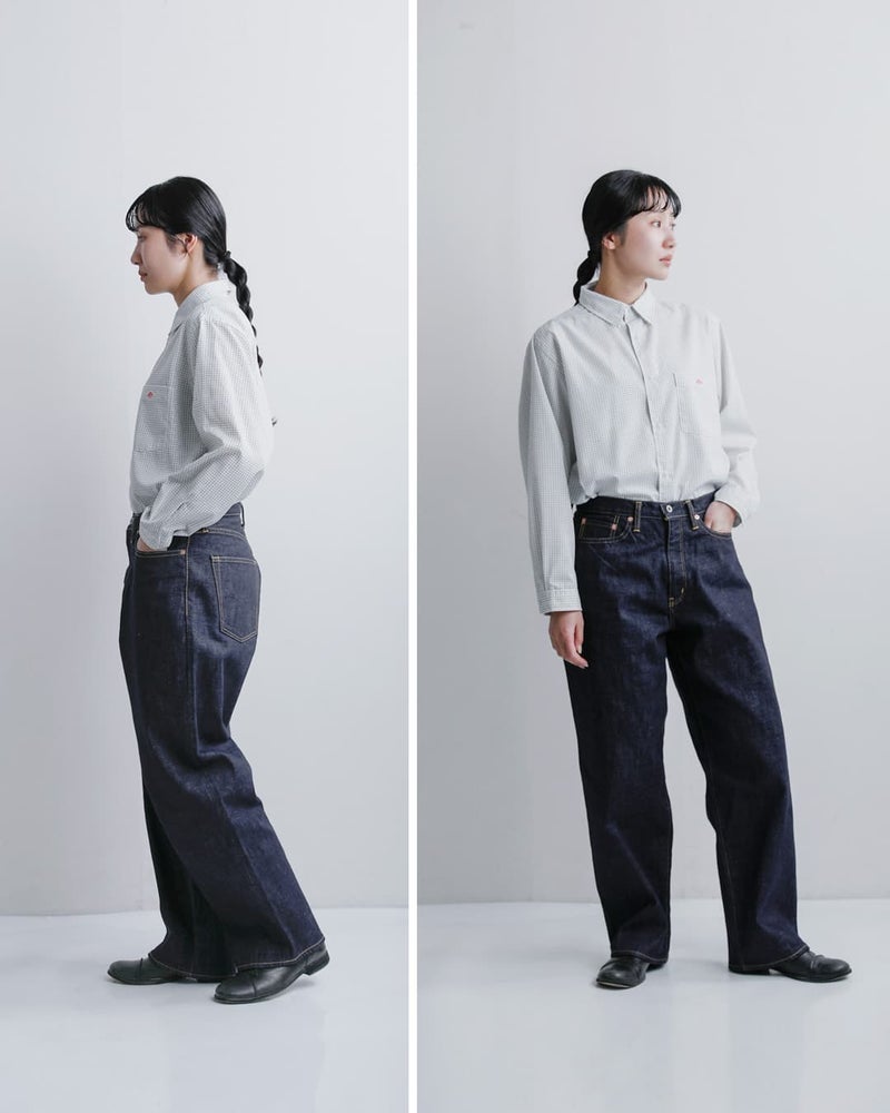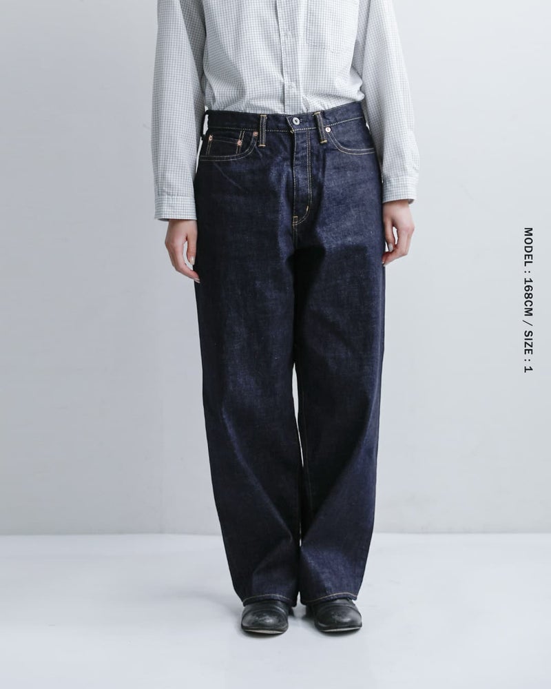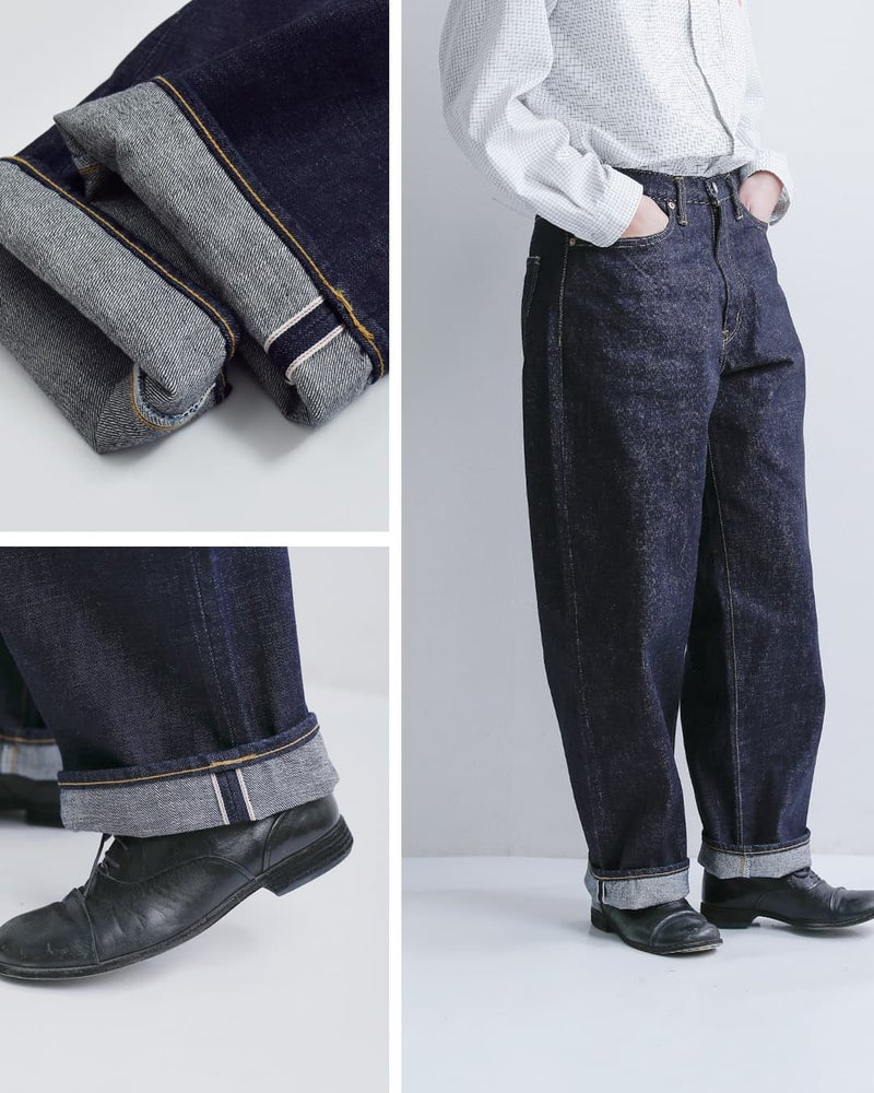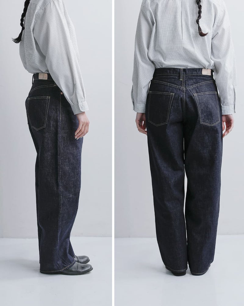 やや深めの股上設計により、ウエスト位置で穿いた際にも安定感があり、トップスをタックインしたスタイリングにも好相性。視覚的にも脚長効果が期待でき、重厚なデニムでありながら軽やかな印象に仕上がっています。