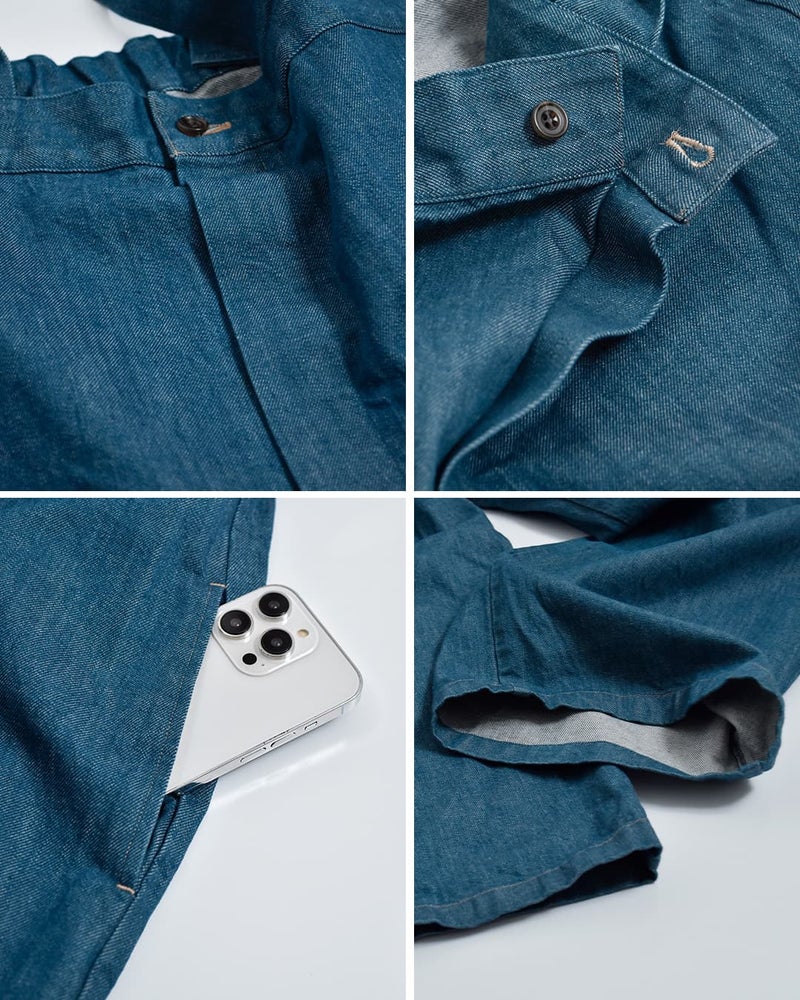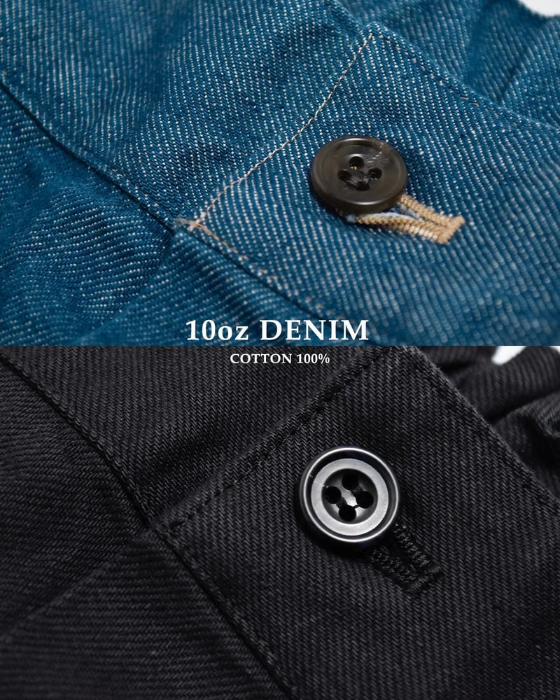 しっかりとした生地感でありながら程よい厚みの10ozデニム。動きやすく快適な着心地で、毎日のデイリーウェアとしても最適です。着込むほどに風合いが増し、自分だけの味わいを楽しめる一枚です。