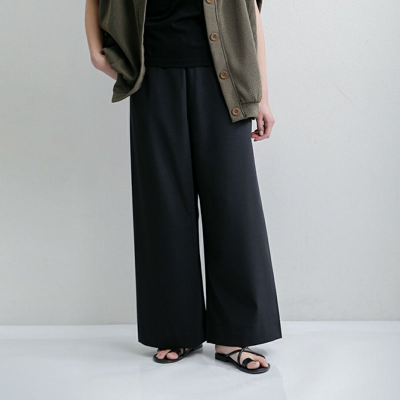 リサイクルポリエステルとサイロスパンを組み合わせた、ドライタッチでシワになりにくい素材を使用しています。見た目は、サマーウールのような、軽やかで美しい表情のきれいめ素材。一方で着心地は非常にリラックスしていて、端正な印象からは想像できないほど快適です。
