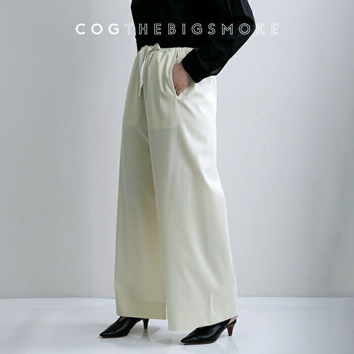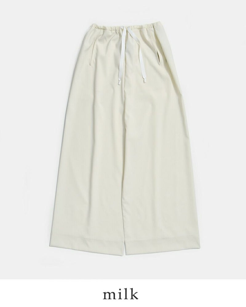 ・ワイドレッグ ・ウエストはゴム&ドローストリング仕様 ・両サイドにポケット ・バックのタグがさり気ないアクセント。