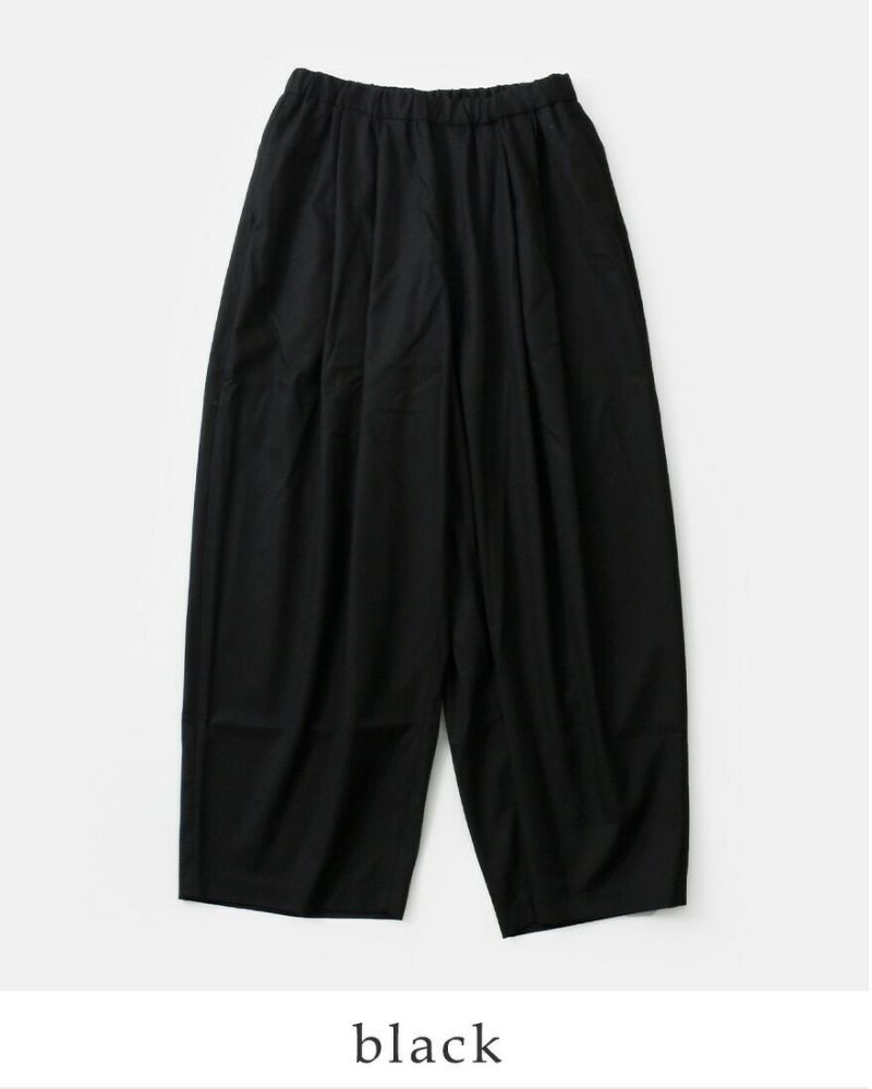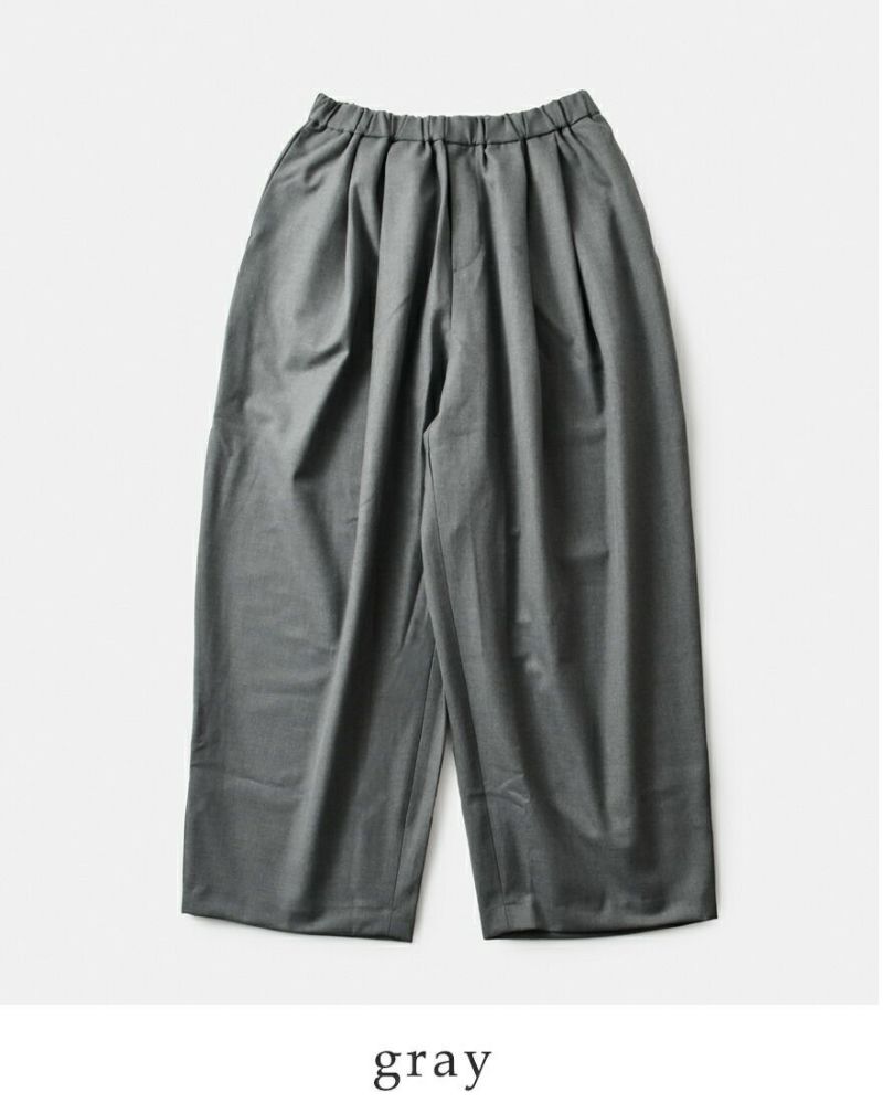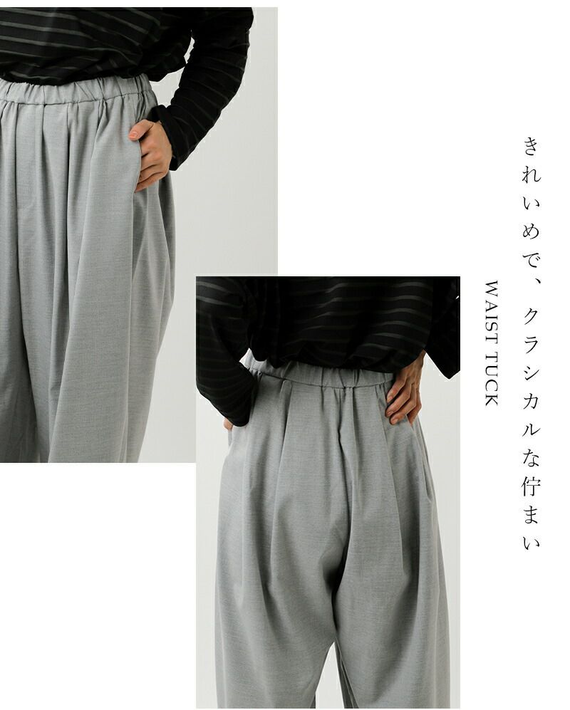 落ち度のある生地が、ウエスト下のタックをより引き立ったきれいめな表情に仕上げています。