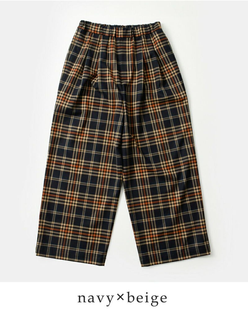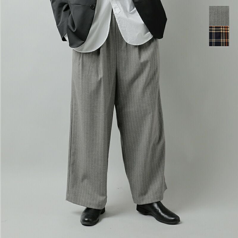 ゆったりリラックスして穿けるウールライクな生地のウエストゴム仕様のチェックストライプ柄のワイドパンツ TRAVAIL MANUEL トラバイユマニュアル