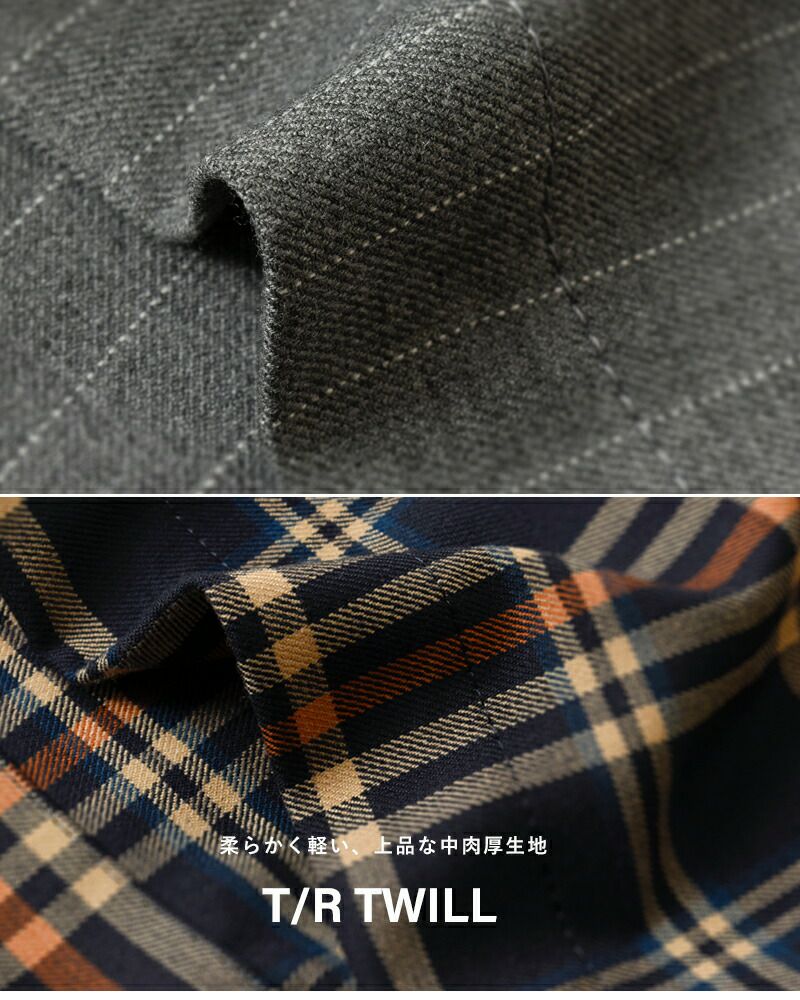 ロングシーズン活躍してくれる中肉厚のT/Rツイル生地。ウールライクな雰囲気が秋冬にぴったりです。軽くて丈夫でシワになりにくく、速乾性も高いのも嬉しいポイント♪ハリ感を残しつつ柔らかさのある生地感。微光沢があり、穿いた時に心地良く、上質感も出してくれます。