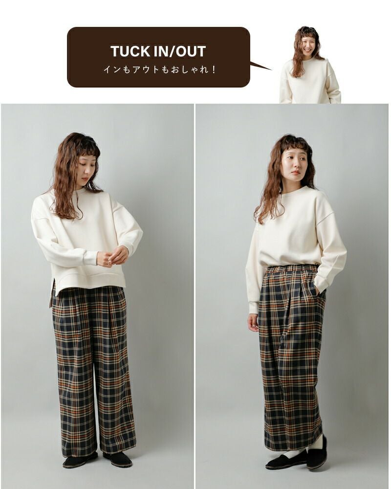 深い股上で動きやすく、足運びもスムーズ。ボリュームがありつつもストンと落ち感があるので膨らみすぎず、美しく体型をカバーします。リラックスしながらも見た目はスッキリという、メリハリのあるデザインが特徴です。