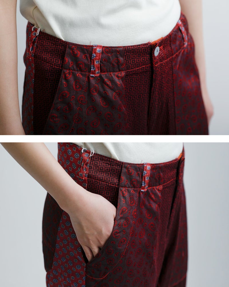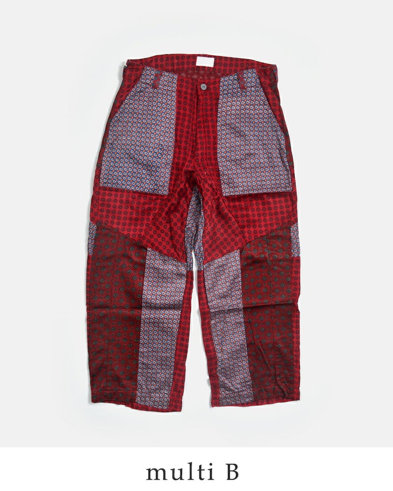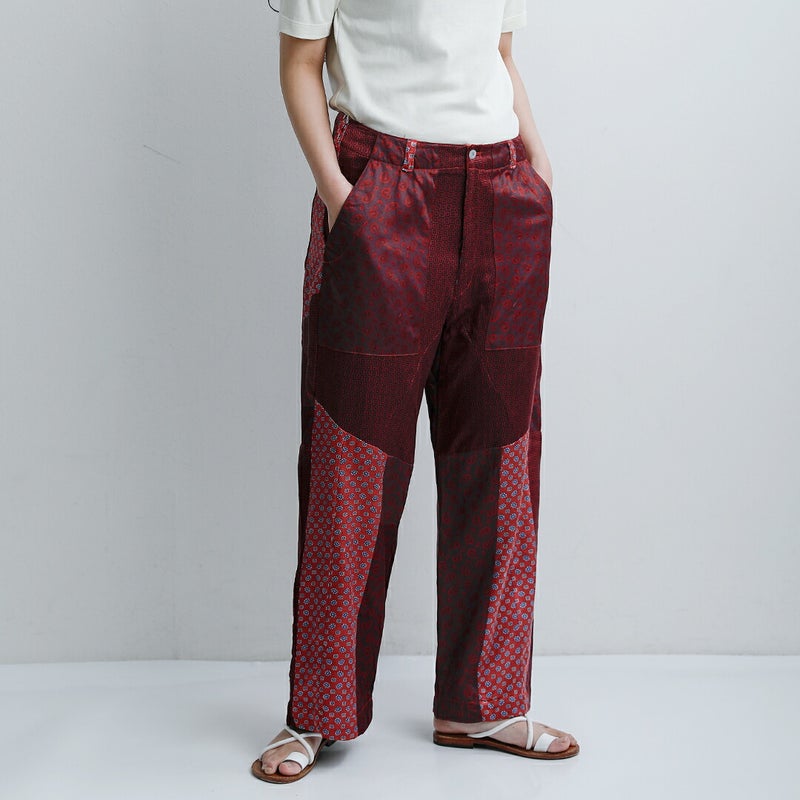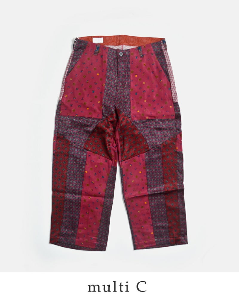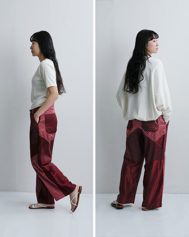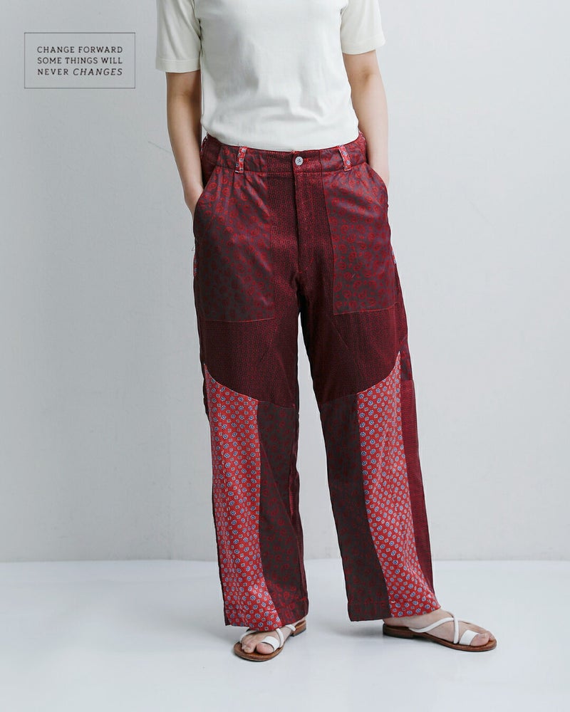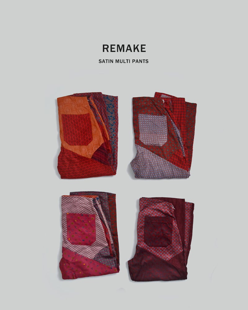 CHANGES(チェンジーズ)より、サテンリメイクマルチパンツのご紹介です。古着のサテンウエアを解体し、パッチワーク状に再構築した「CHANGES」を象徴するリメイクパンツ。サテン特有の上品な光沢と、計算されたマルチカラーの配置が、唯一無二の存在感を放ちます。一見個性的ですが、シンプルなTシャツやスウェットと合わせるだけでスタイリングが完成する主役級のパンツです。