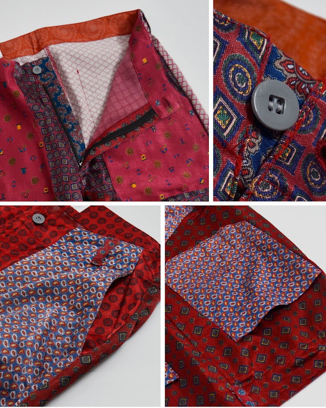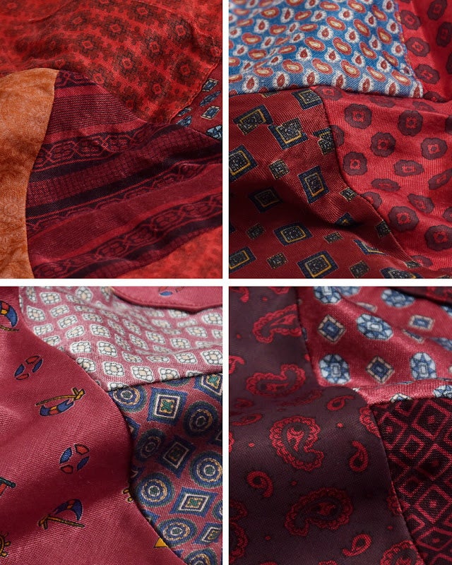 様々な個性的な柄と美しい光沢感で存在感のある素材です。本製品はヴィンテージ素材を使用しているため、生地の擦れ、色ムラ、小さな穴などがある場合がございます。これらはデザインの一部であり、リメイク品の特性としてご理解ください。