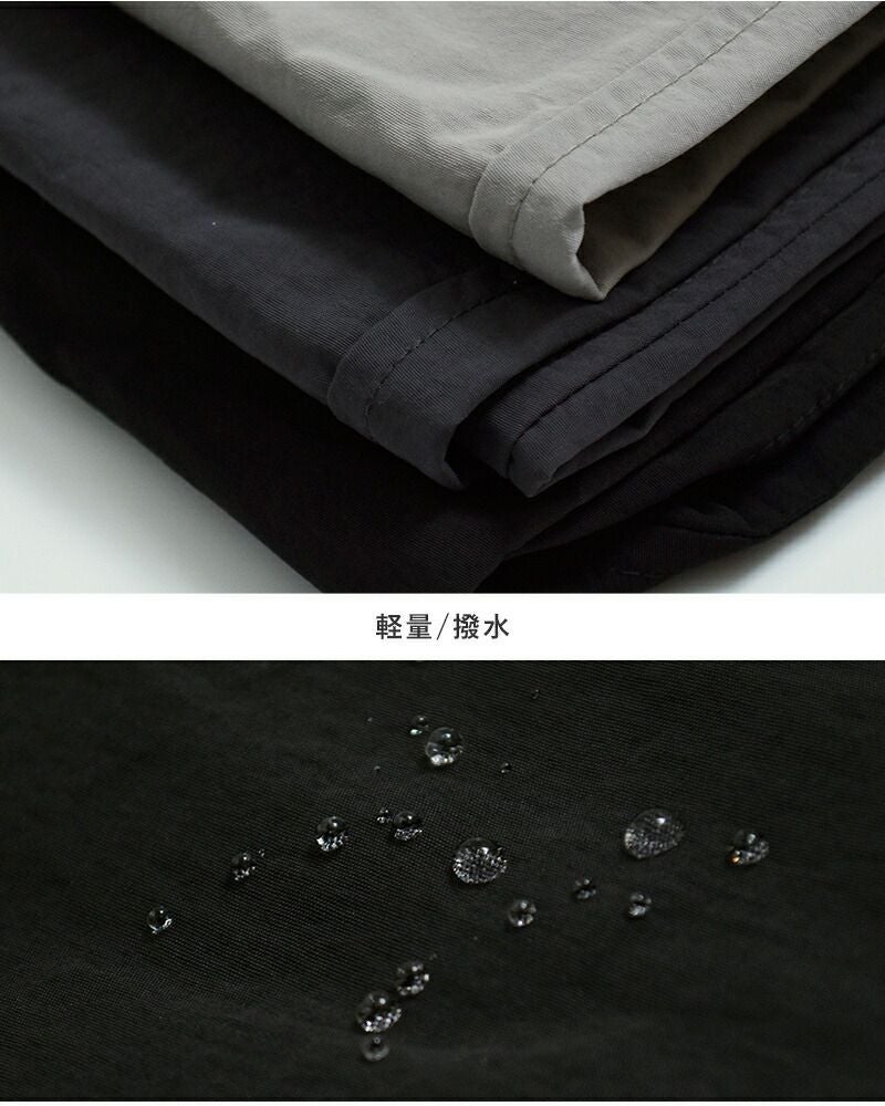 シワ感のあるナチュラルな風合いが魅力の軽量タスランナイロンを使用。 程よいハリを持ちながらも軽やかな着心地で、ラフになりすぎない上品な表情に仕上げています。 さらに撥水加工を施し、小雨や水滴をしっかりガード。 アウトドアから通勤・通学まで、天候に左右されにくい安心感のある機能性を備えています。