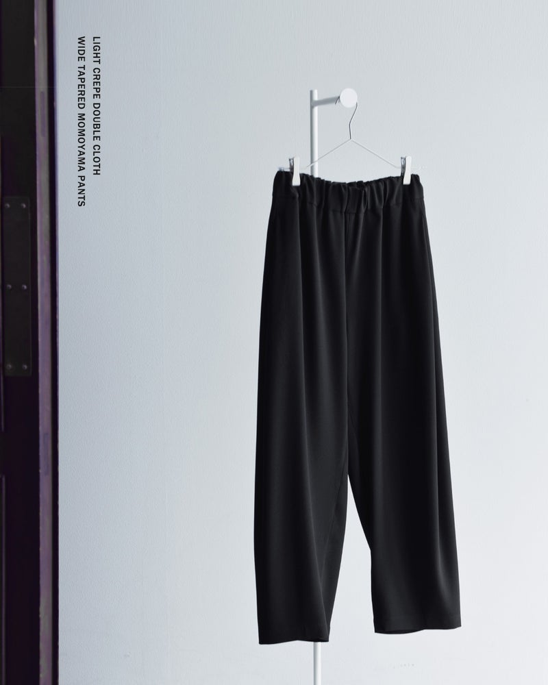 NOCONTROLAIR(ノーコントロールエアー)より、ライトクレープダブルクロスワイドテーパードモモヤマパンツのご紹介です。ブランド定番のライトクレープダブルクロス生地を使用した、立体感のある形が特徴のモモヤマパンツ。軽やかな着心地ながら適度なハリと落ち感があり、上品でシルエットが美しく決まるのが特徴です。
