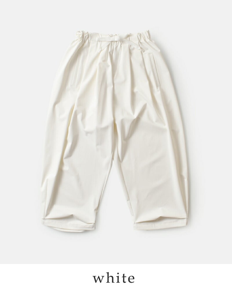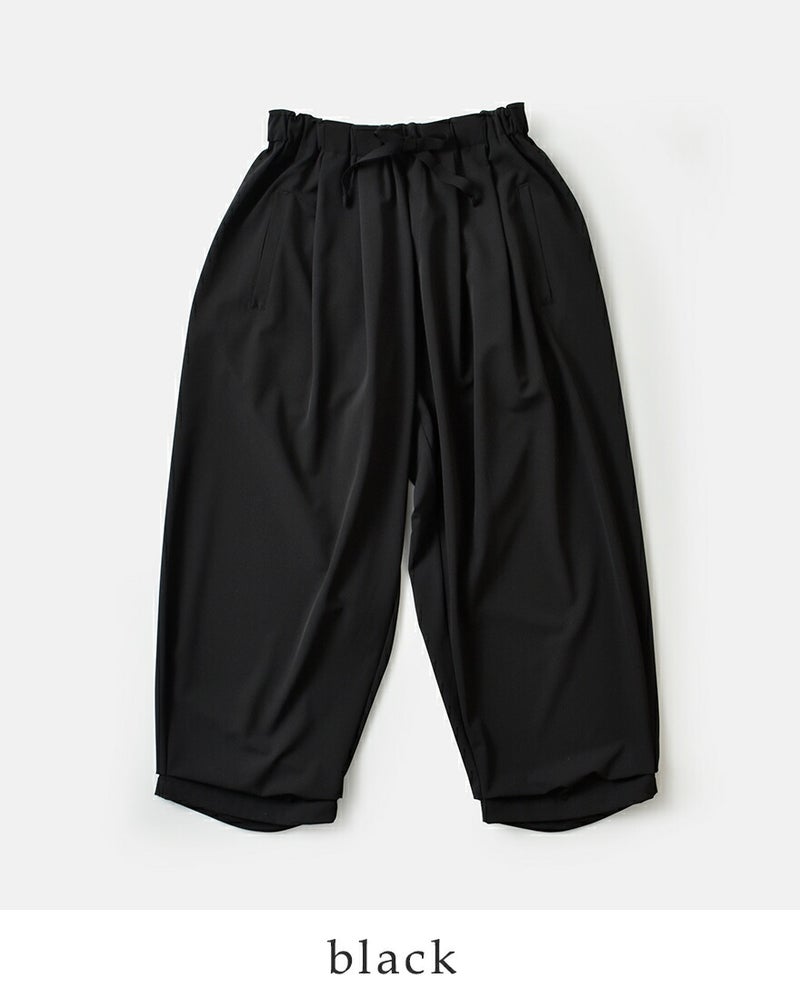 裾の内外に織り込まれたタックを配し、ストレートなラインにわずかなたるみを持たせたデザイン。ハーレムパンツのような、奥行きのある独特の立体感を演出しています。