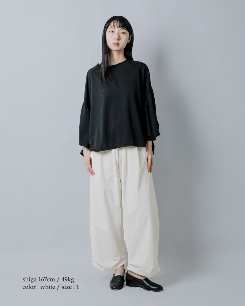たっぷりとした生地感を活かしながら、動くたびに生まれる自然なドレープが印象的。リラックス感の中に洗練を感じさせ、カジュアルにもきれいめにも馴染む佇まいです。