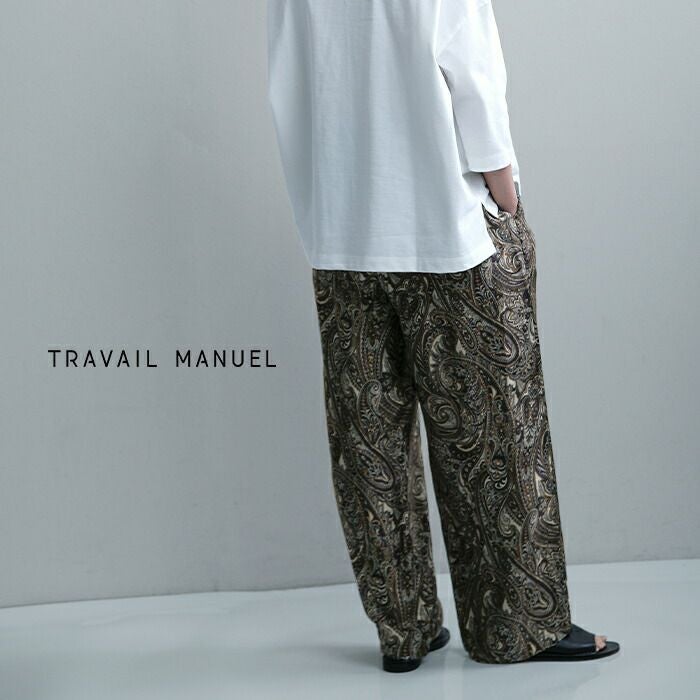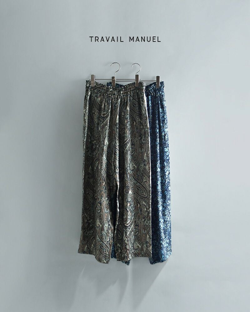 TRAVAIL MANUEL(トラバイユマニュアル)より、ボタニカル プリント サッシュ ワイド パンツのご紹介です。キュプラ×レーヨンのプリント素材を使用し、奥行きのある色合いと、なめらかな肌触りが魅力です。落ち着いた印象の柄行きで、上品に取り入れていただけます。ほどよい落ち感のある生地が軽やかな印象を演出し、シャーリング仕様のウエストとセミワイドラインで、ストレスフリーな穿き心地を実現。軽くて柔らかな素材感で、デイリーにもリラックススタイルにも活躍する一本です。