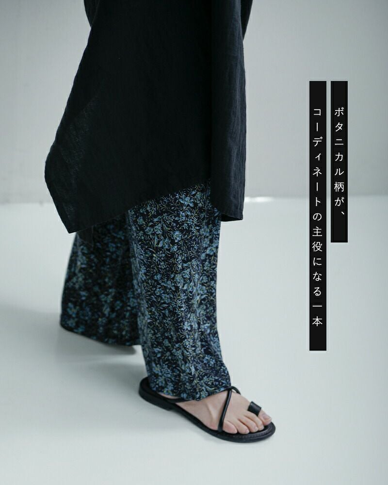 ボタニカル柄がコーディネートの主役になる一本で、落ち着いた配色としなやかな落ち感が甘さを抑え、合わせるだけで洗練された印象に仕上がります。