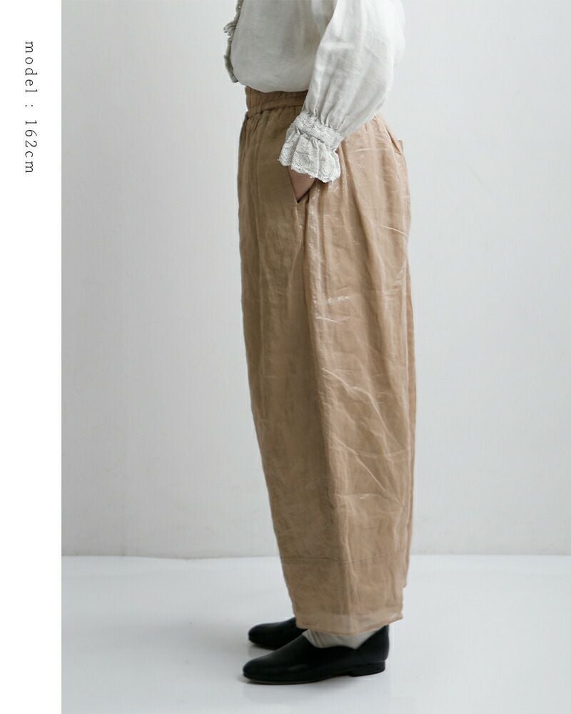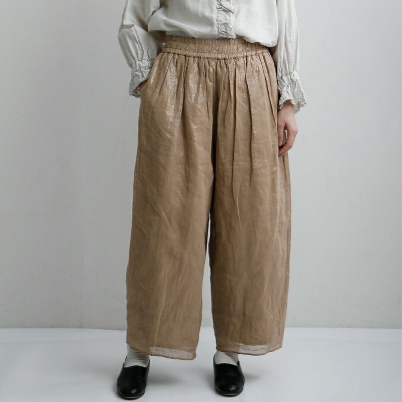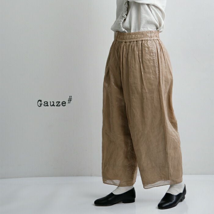 Gauze#で人気の高い、たっぷりとボリュームを持たせたヌーボーパンツ。 贅沢に使用された生地が、空気を含んだような立体的なフォルムを作り出し、体のラインを拾わずリラックスした履き心地を叶えます。重たさを感じさせない軽快な動きが、装いに成熟したニュアンスをプラスします。