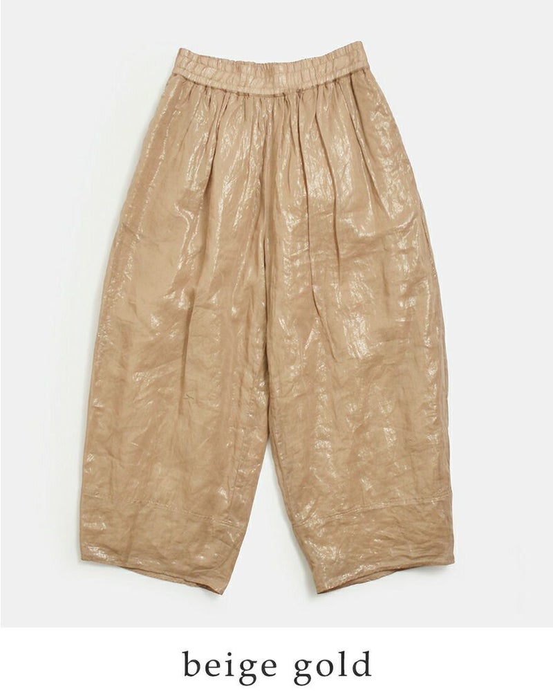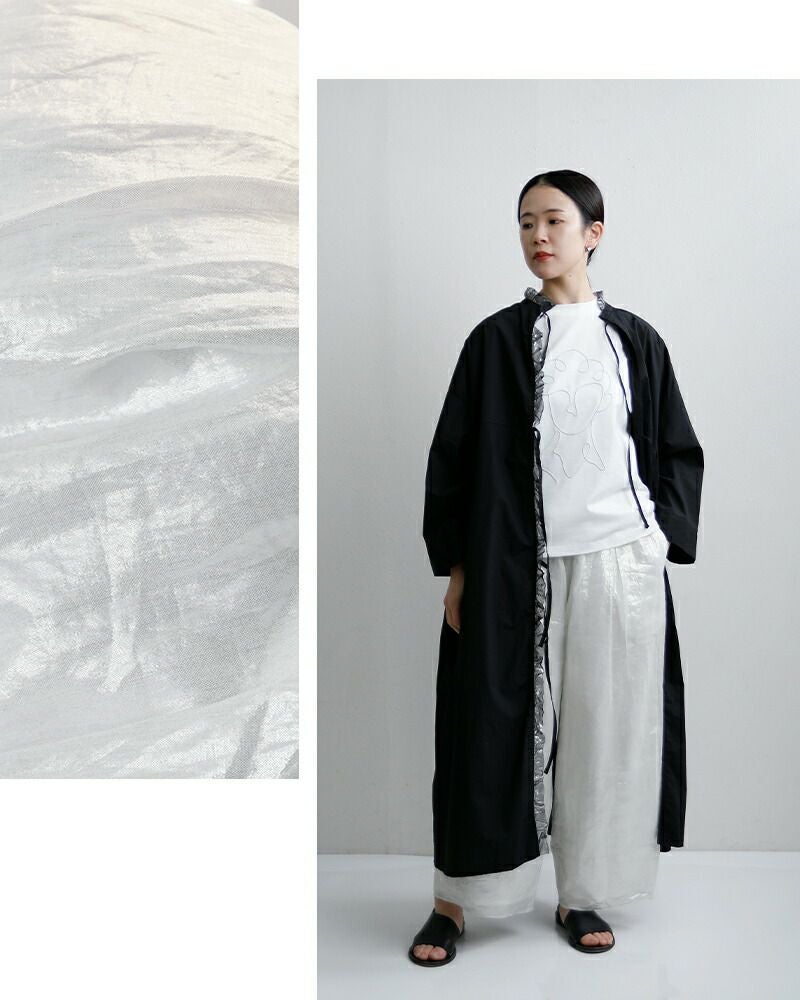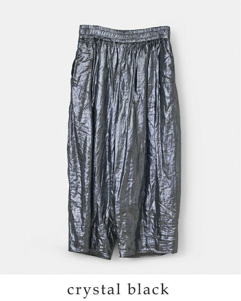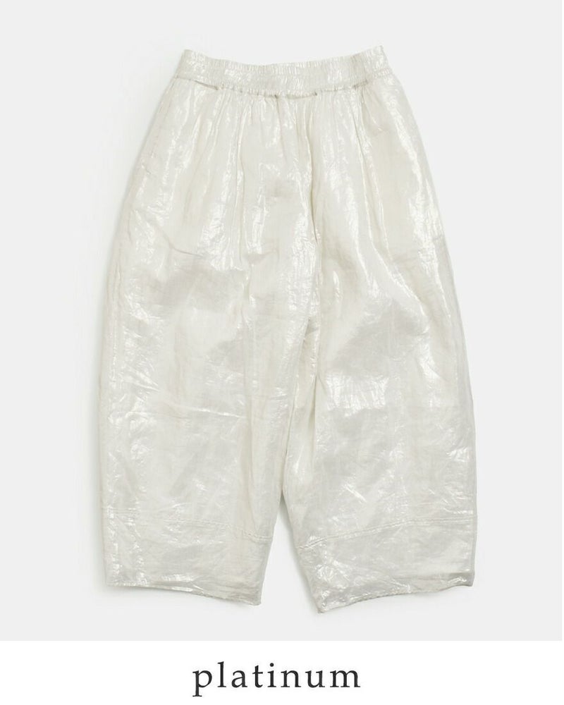 Gauze#(ガーゼ)よりコットン コズミック ヌーボーパンツ COSMIC NOUVEAU PANTSのご紹介です。光の粒を纏ったような幻想的な表情が魅力のたっぷりとボリュームを持たせたヌーボーパンツ。ドライな肌触りのコットンボイル生地をベースに、繊細な箔加工を贅沢に施されています。宇宙を想起させるような静かなきらめきが、歩くたびに光を受けて表情を変え、見る人を惹きつけるモダンで洗練された佇まいを演出します。