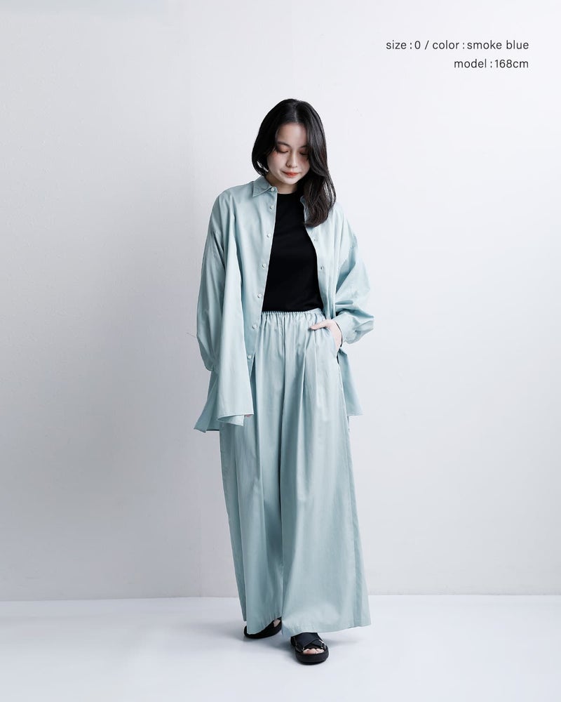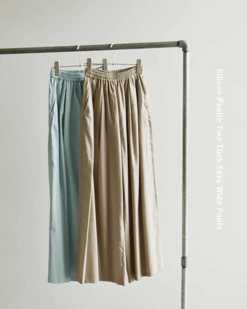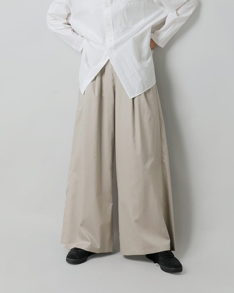 graphpaper(グラフペーパー)よりシリコン ポプリン ツータック ワイドパンツ “Silicon Poplin Two Tuck Wide Pants”のご紹介です。深い2タックでフロントにボリュームを持たせたワイドパンツ。歩くたびに美しく揺れる、たっぷりと使用した生地感が魅力の一枚。超長綿で織り上げた平織り生地にシリコンを原料にした特殊樹脂を含浸することで生地に反発感とハリ感を持たせ、さらにバイオ加工を合わせることで滑らかで柔らかい風合いを表現した素材。綿100%と思えないシルクのような質感が特徴です。