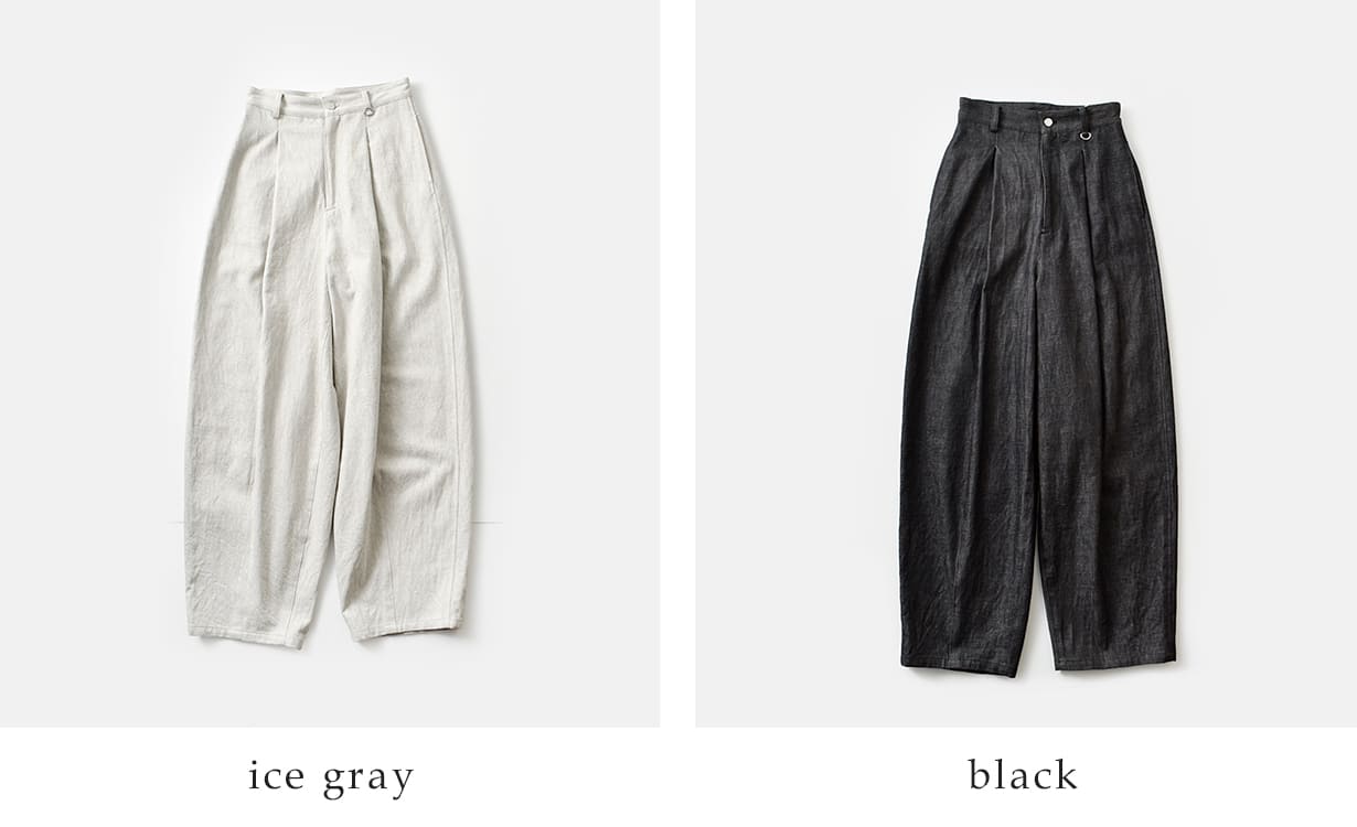 ナチュラルな素材感と、構築的なコクーンシルエットが共存した雰囲気のパンツです。 リラックス感がありながらも、タックやダーツによる立体的な設計により、ラフになりすぎない印象に仕上がっています。