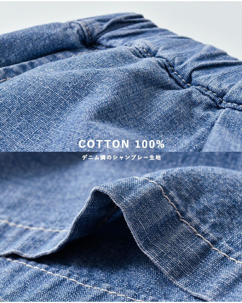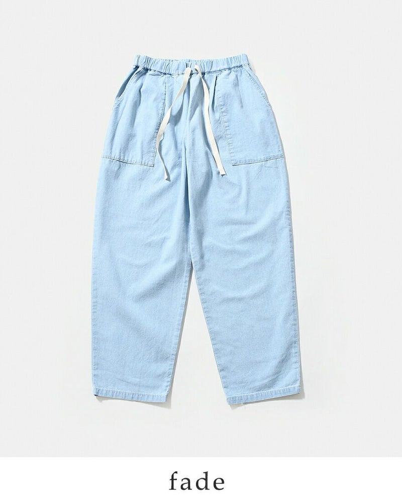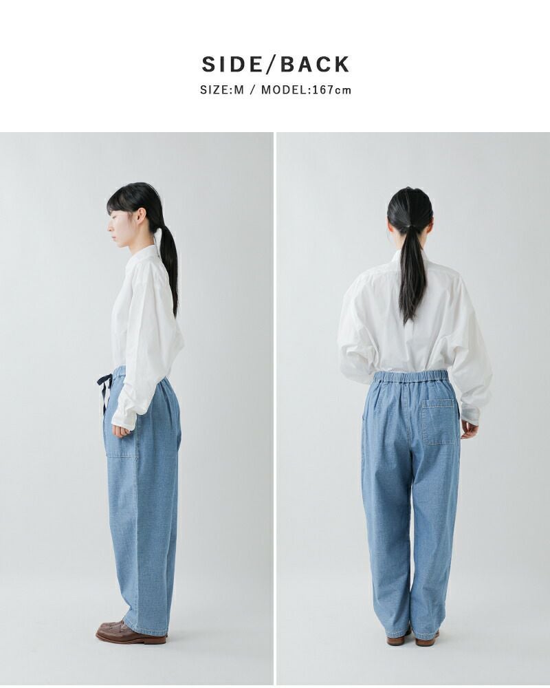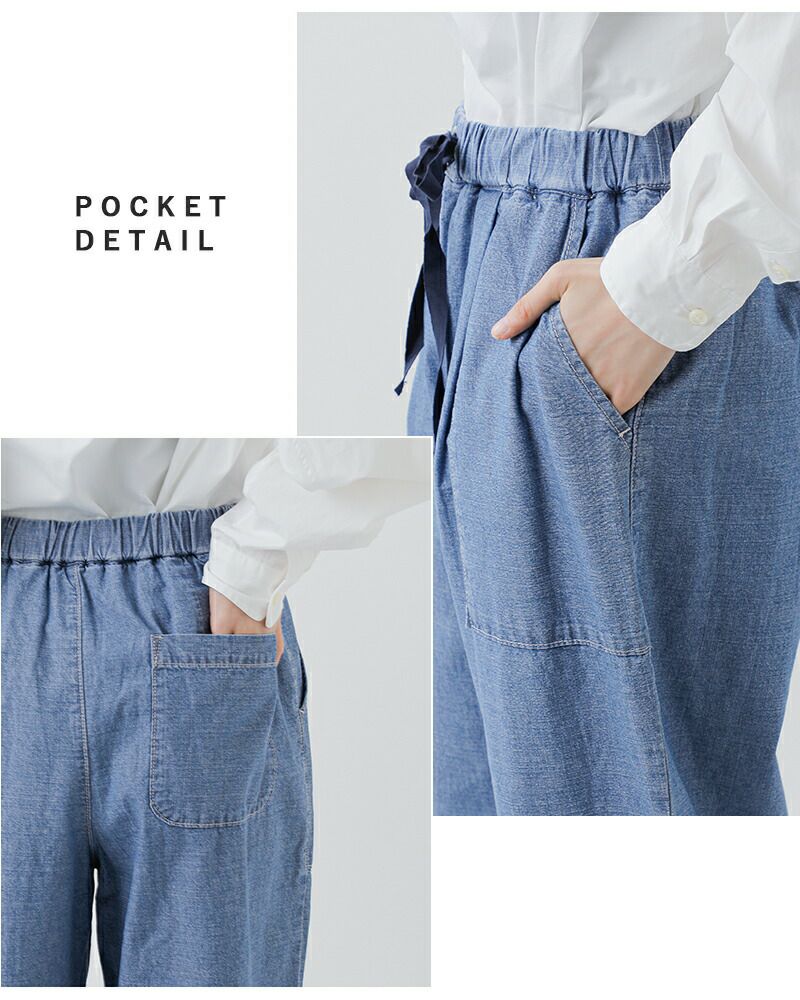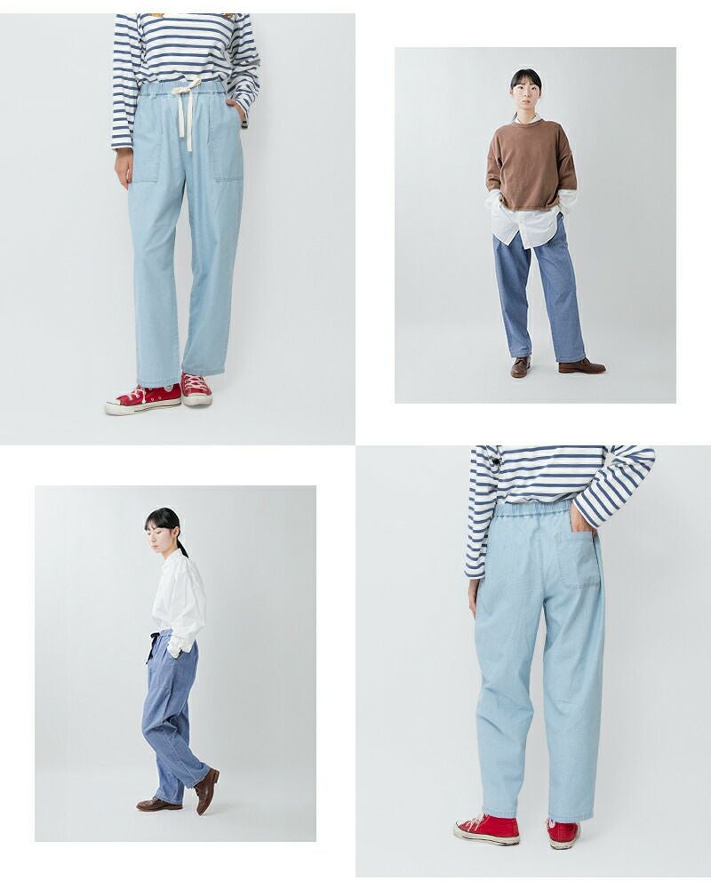 薄手でさらりとした肌触りが心地よく、汗ばむ季節でも快適に着用いただけます。 見た目はデニムライクながら、やわらかく軽い穿き心地で、夏場でもストレスのない仕上がり。 清涼感のある素材感が、暑い季節のデイリースタイルにぴったりな一本です。