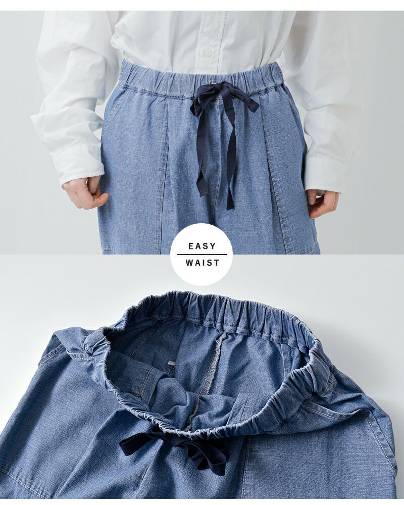 ウエストはゴム仕様+紐付きのイージーウエストデザインで、締め付け感の少ない快適な穿き心地が魅力。 正面にあしらわれた紐をリボンのように結ぶことで、ナチュラルさの中に程よい華やかさを添えたウエストデザインを演出します。