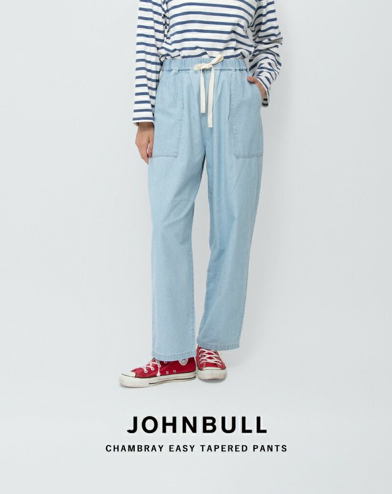 Johnbull(ジョンブル)より、シャンブレー イージー テーパード パンツのご紹介です。 軽やかなシャンブレー素材を使用した、デイリーに取り入れやすいイージーパンツ。 フロントにタックを施し、ウエストはゴム仕様にすることで、リラックス感のある穿き心地を叶えつつ、腰まわりには程よいゆとりを持たせました。 裾にかけてすっきりと細くなるテーパードシルエットが、全体をきれいなバランスにまとめ、カジュアルながらも上品な印象に。 シンプルなデザインで、きれいめからカジュアルまで幅広いスタイリングに対応する、着回し力の高い一本です。