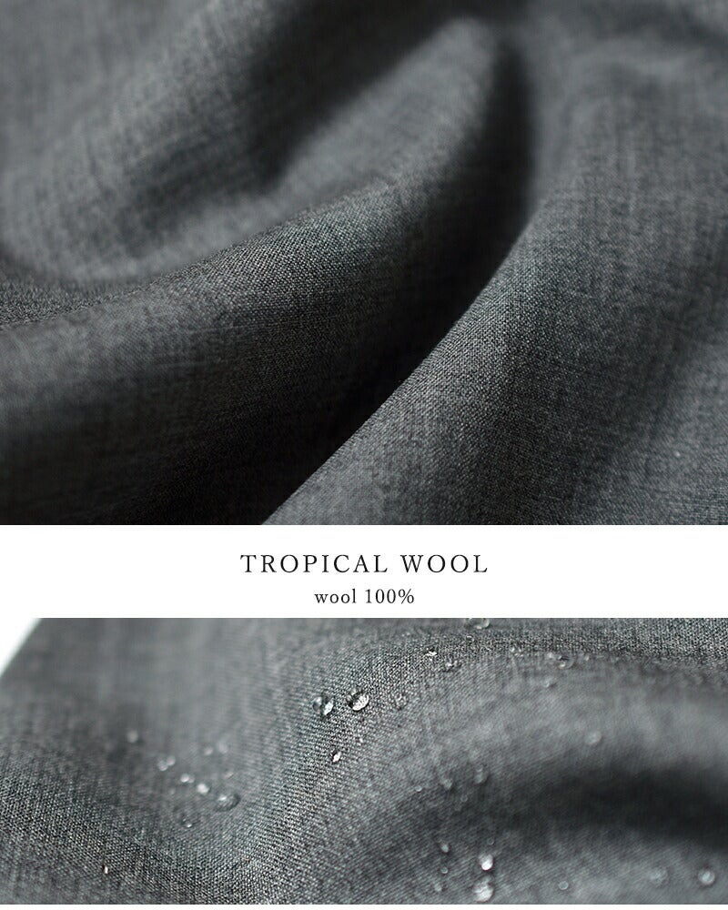 タテ・ヨコともに、メリノウールの細番手Super100'sの2/80を使用した平織り素材。細番手でありながら高密度で織られ、原料の良さからくる上質さと薄さが特徴のトロピカルウールです。仕上げにはナノ撥水を施しており、ウールの持つ撥水性を高めています