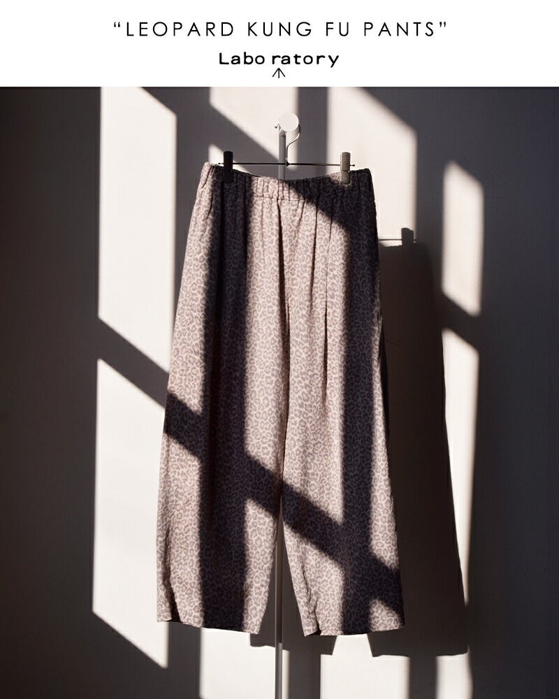Laboratory(ラボレイトリー)よりコットン レオパード カンフーパンツ “LEOPARD KUNG FU PANTS”のご紹介です。遊び心あふれるシルエットとヴィンテージライクな表情が魅力のカンフーパンツ。どこか懐かしく、奥深い風合いのレオパードファブリック。派手になりすぎない絶妙なカラーバランスの豹柄は、日々のコーディネートに小気味よい「GOOD SPICE」を加えてくれます。