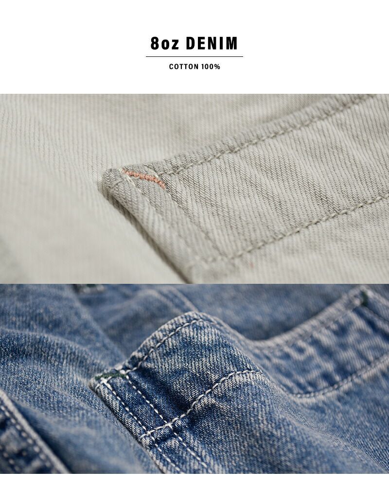 素材には、程よい厚みと柔らかさを兼ね備えた8ozライトデニムを使用。 見た目は本格的なデニムの表情を持ちながら、軽やかな着心地で、長時間の着用でもストレスを感じにくい仕上がりです。 加工によって生まれる自然な色ムラやアタリが、ヴィンテージ感のある奥行きを演出します。