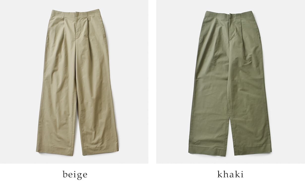 フロントにツータックを配置し、緩やかな膨らみを表現。ウエストボタンのないフロントデザインで、ミニマルでスタイリッシュな印象です。