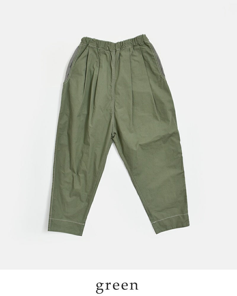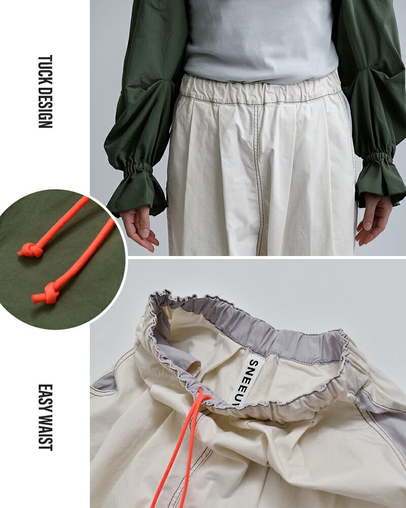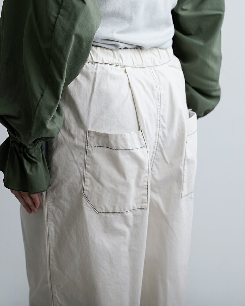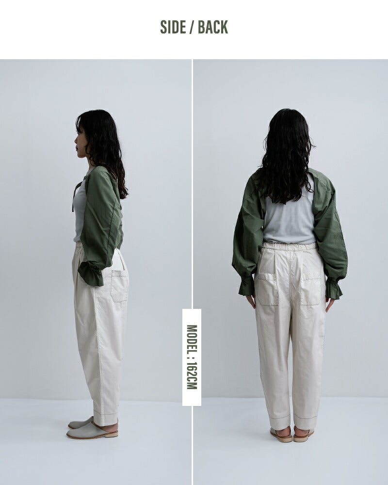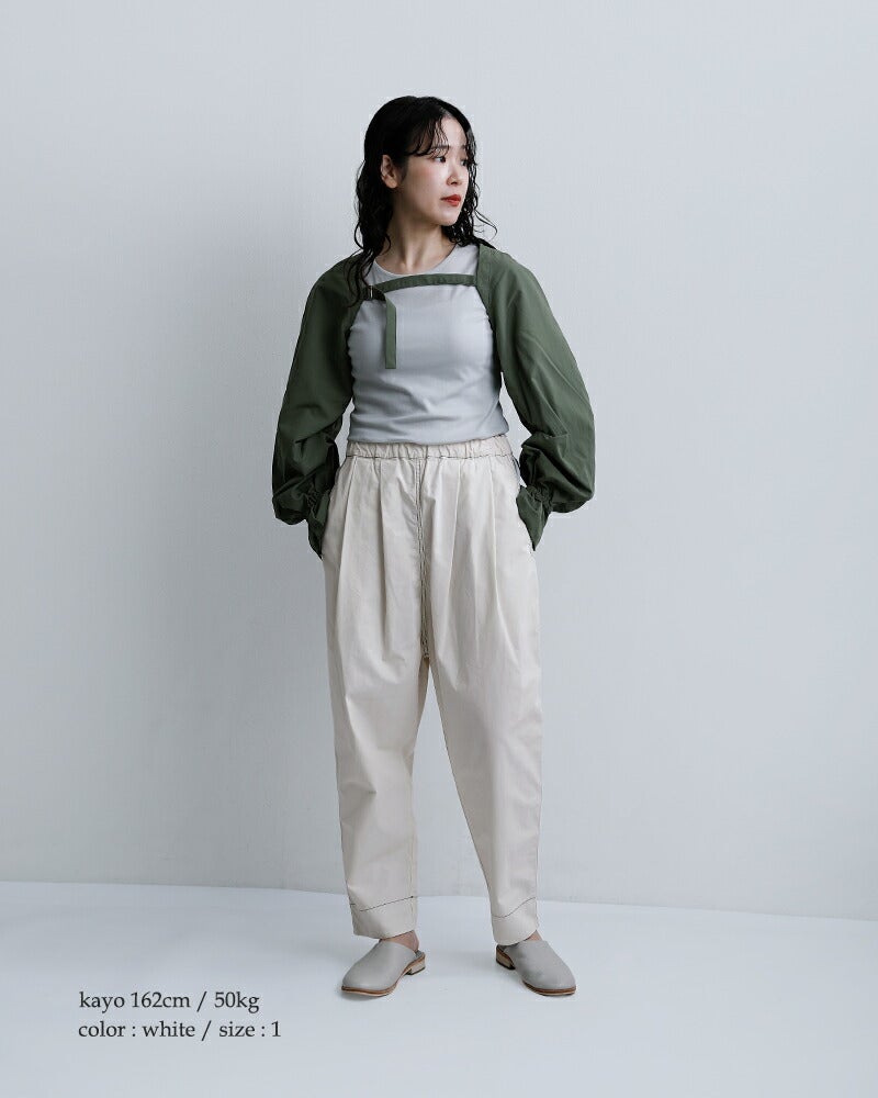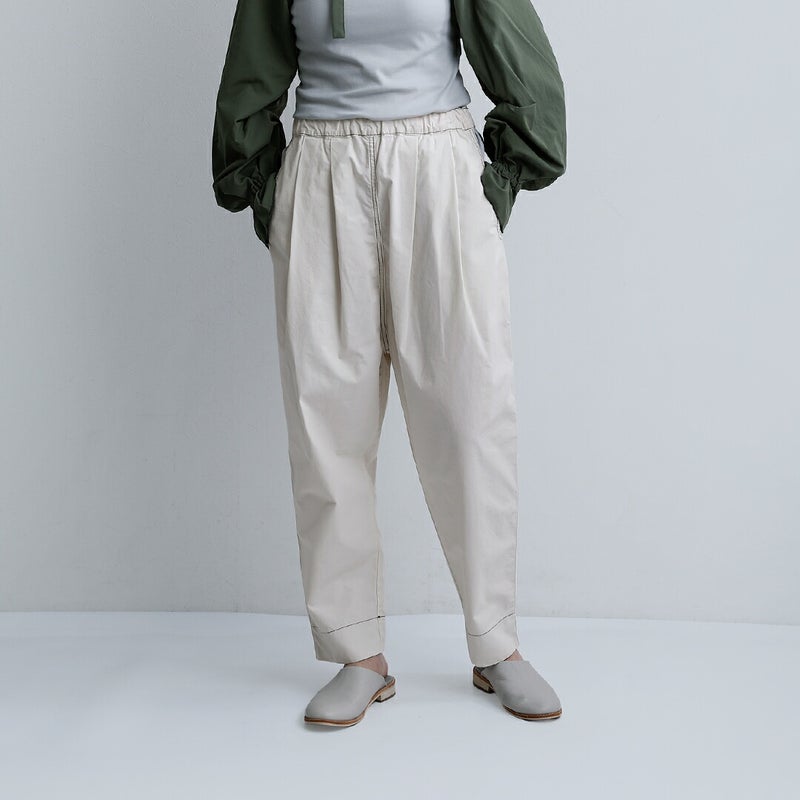 ウエストはゴムとドローコードを通したイージー仕様で、ストレスフリーな穿き心地に。体型やスタイリングに合わせてフィット感の調整が可能です。タックを入れることで腰まわりにゆとりを持たせつつ、すっきりとしたシルエットをキープしてくれるのもポイントです。