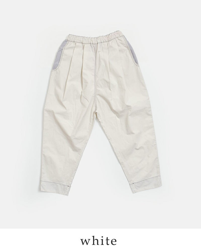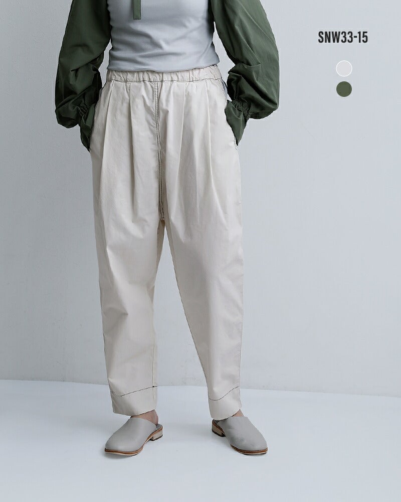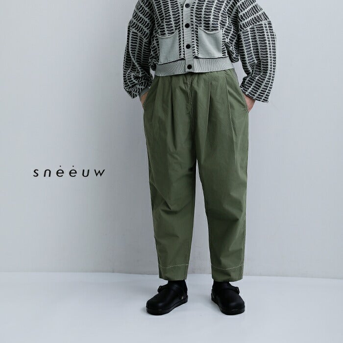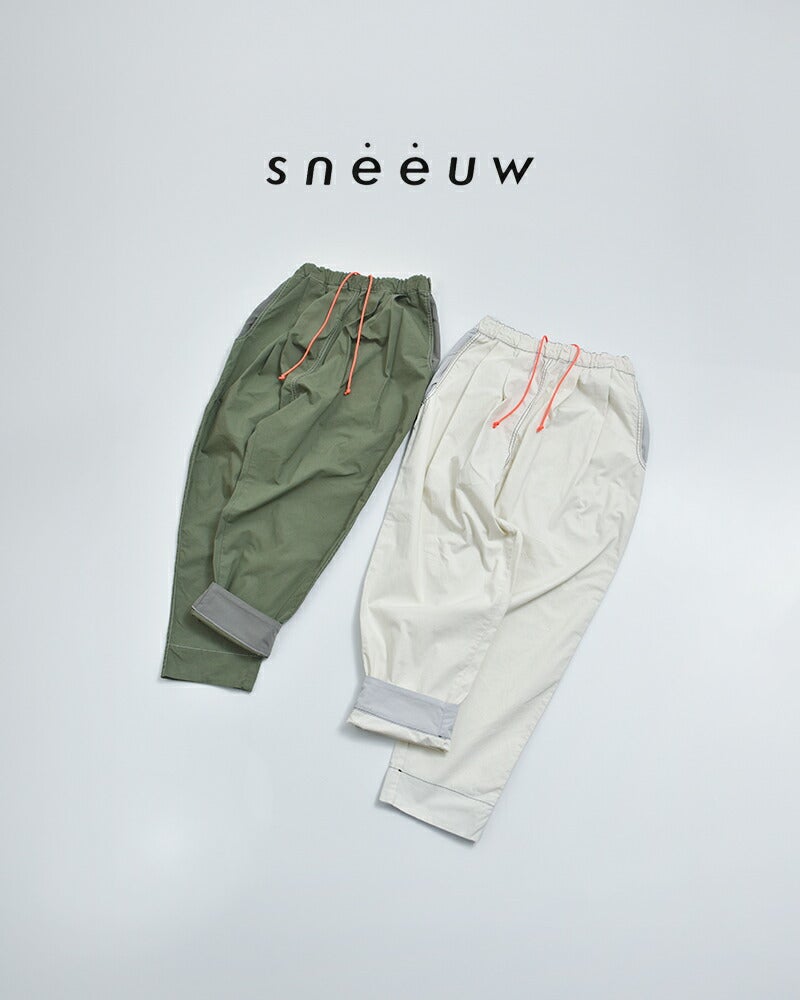 sneeuw(スニュウ)より、コットンタックドローパンツのご紹介です。ブランド定番のタック入りドローパンツは、ゆとりのある太めのテーパードシルエットで、リラックス感がありながらもすっきりとした印象で着用できる一本。ウエストに施されたタックが腰まわりのラインを美しく見せ、立体的なシルエットを生み出します。フロントポケットやウエスト、裾裏にはナイロン素材をあしらい、さりげないアクセントに。裾をロールアップしたアレンジも楽しめます。