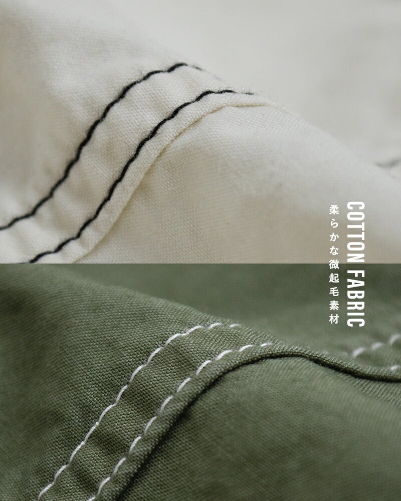高密度に織り上げられた中肉のコットン素材を使用。生地表面には微起毛加工が施されており、しなやかさとコシを併せ持つ上品な風合いが魅力です。程よい厚みでロングシーズン着用しやすく、カジュアルながらも落ち着いた印象に仕上がっています。