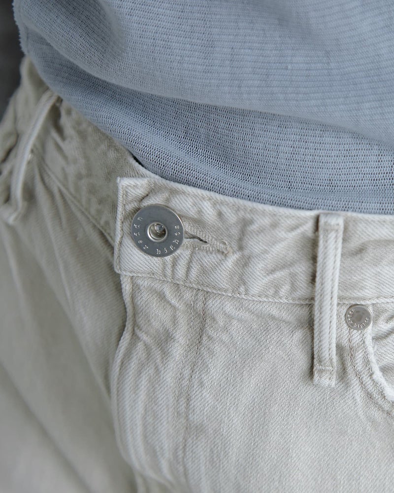 ジッパーフライ式のフロントデザイン。 ボタンにはブランドロゴの刻印が印されていてアクセントに。 ヒップポケット付き。