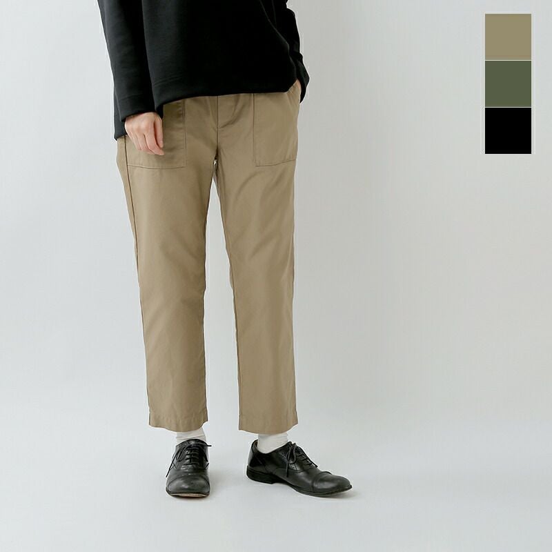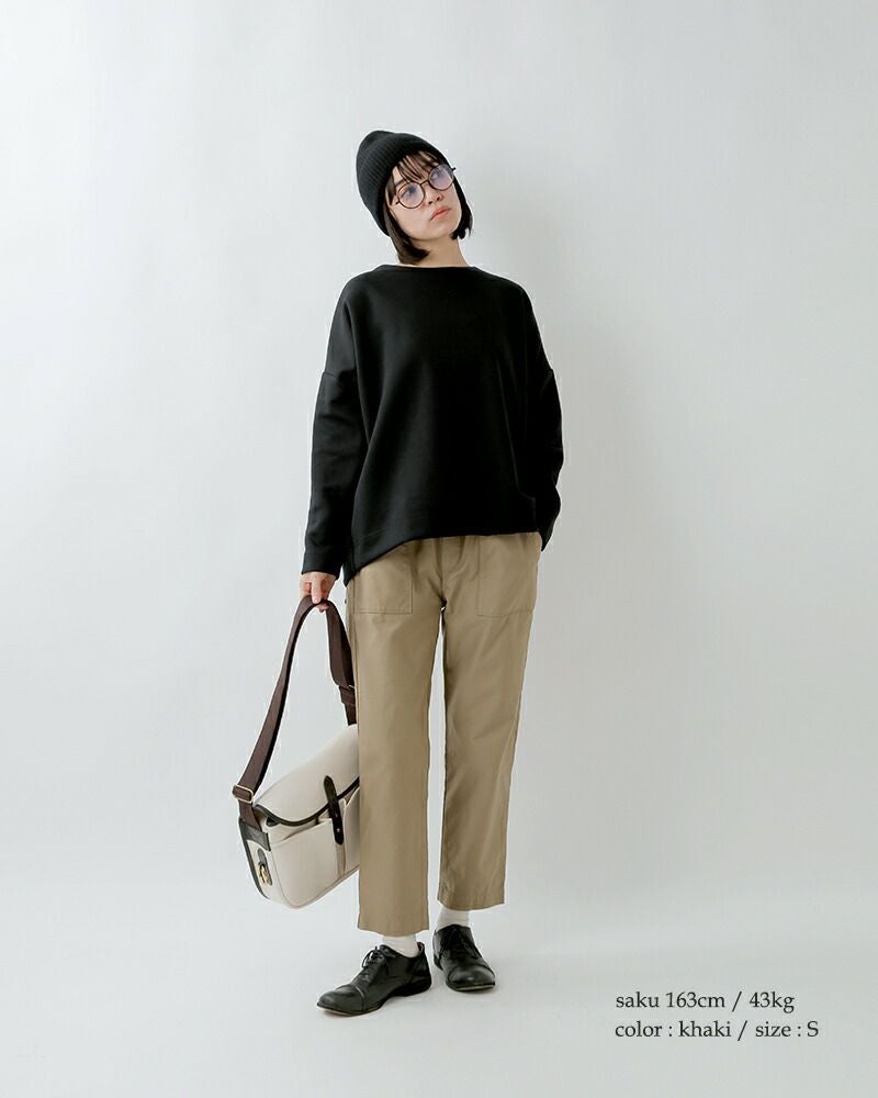 厚すぎない程よい軽さのあるバックサテン生地を使用しています。さらっとした履き心地で、ミリタリーな雰囲気を醸し出します。丈夫な生地でムラ感があり、穿きこんだ際のアタリの出方も楽しんでいただけます。