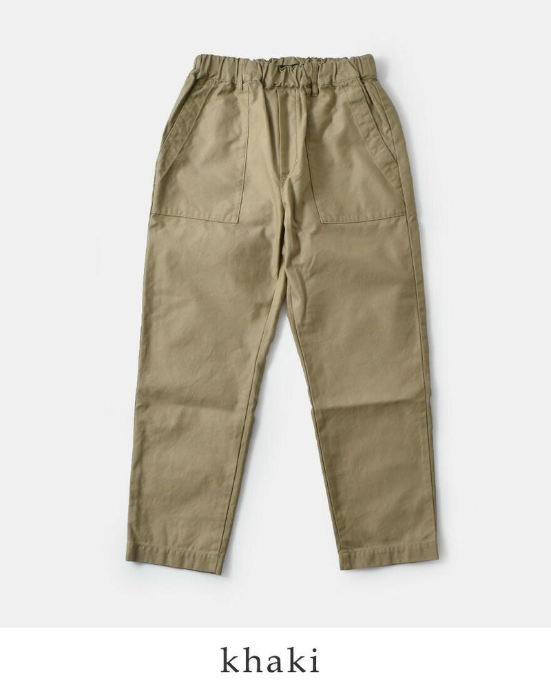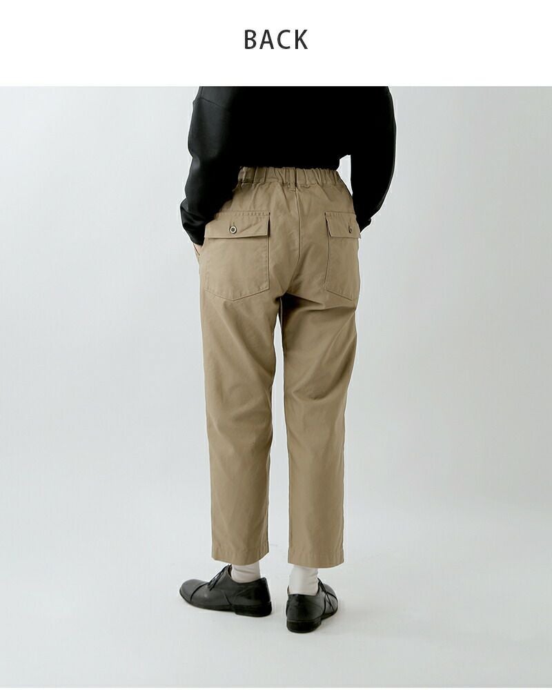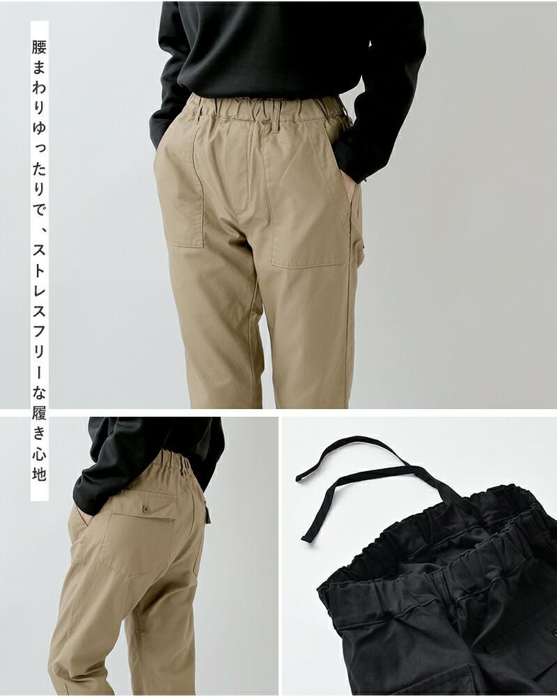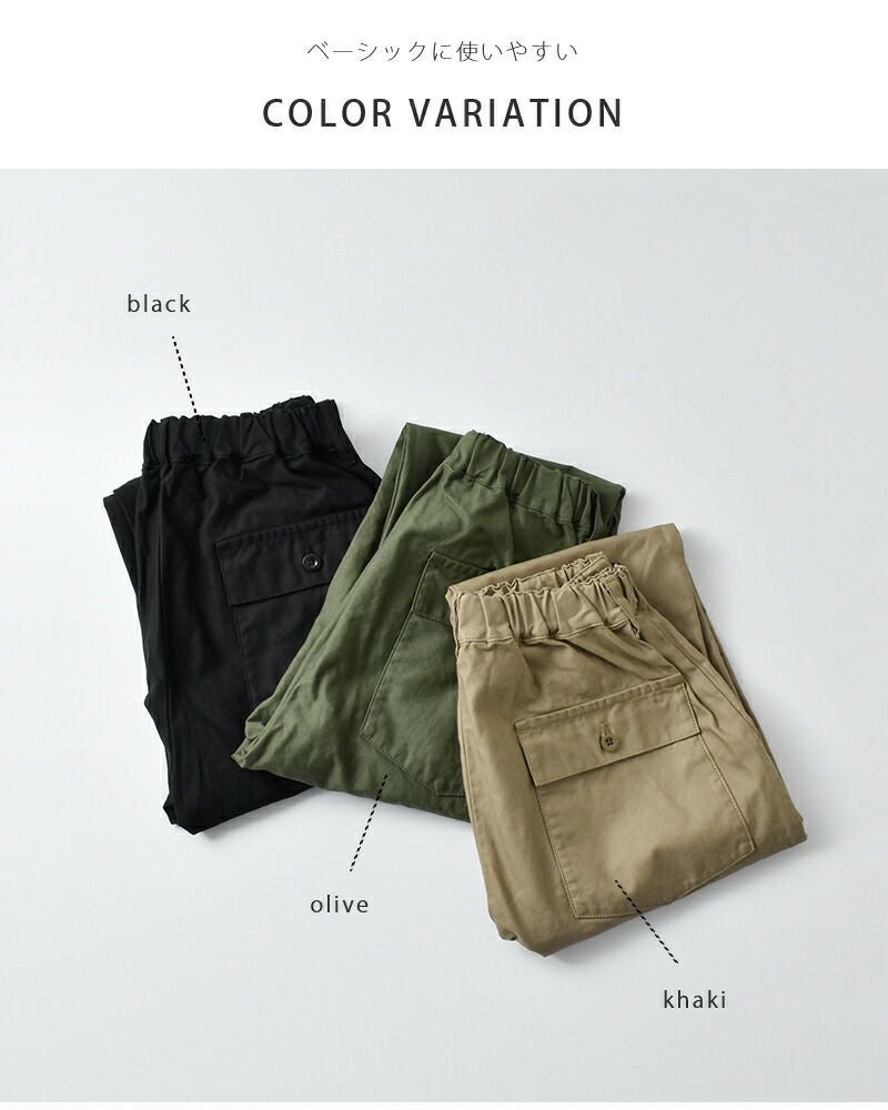 ウエストは総ゴム仕様で、腰まわりはゆったりとしているのでストレスフリーに穿いていただけます。内側には紐が通っており、サイズの微調節も可能です。ヒップポケットがさりげなくミリタリーテイストをプラスします。
