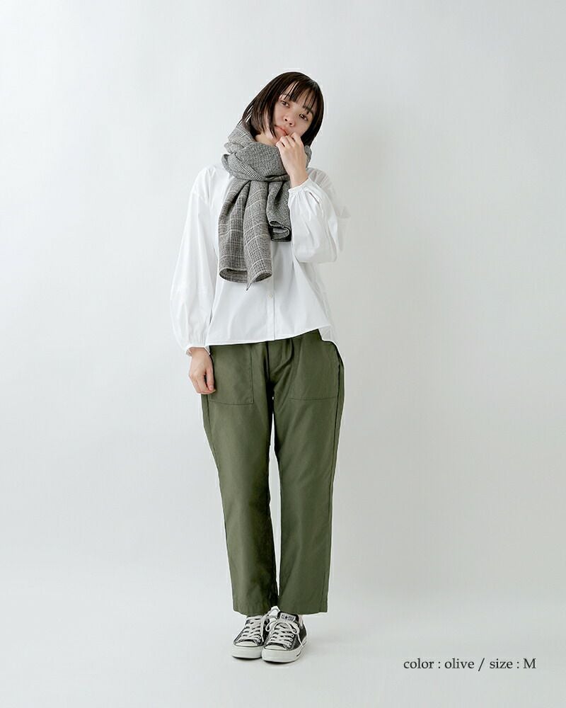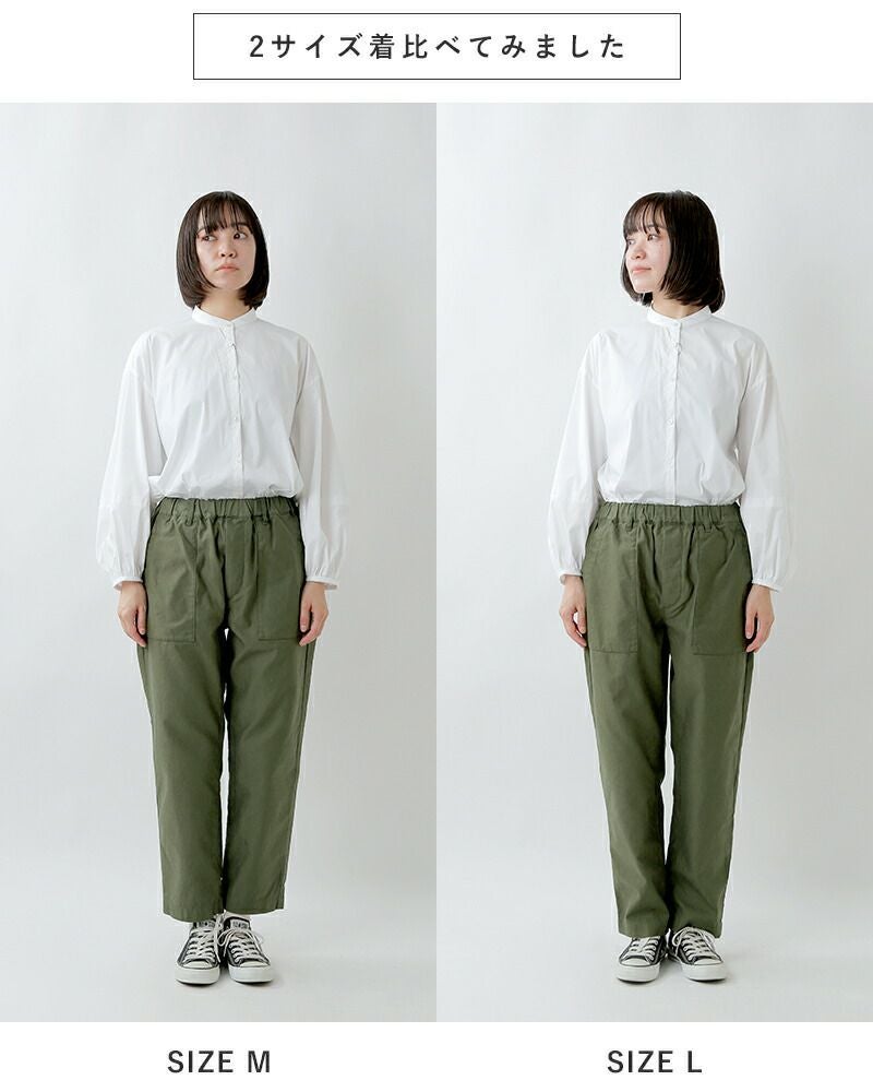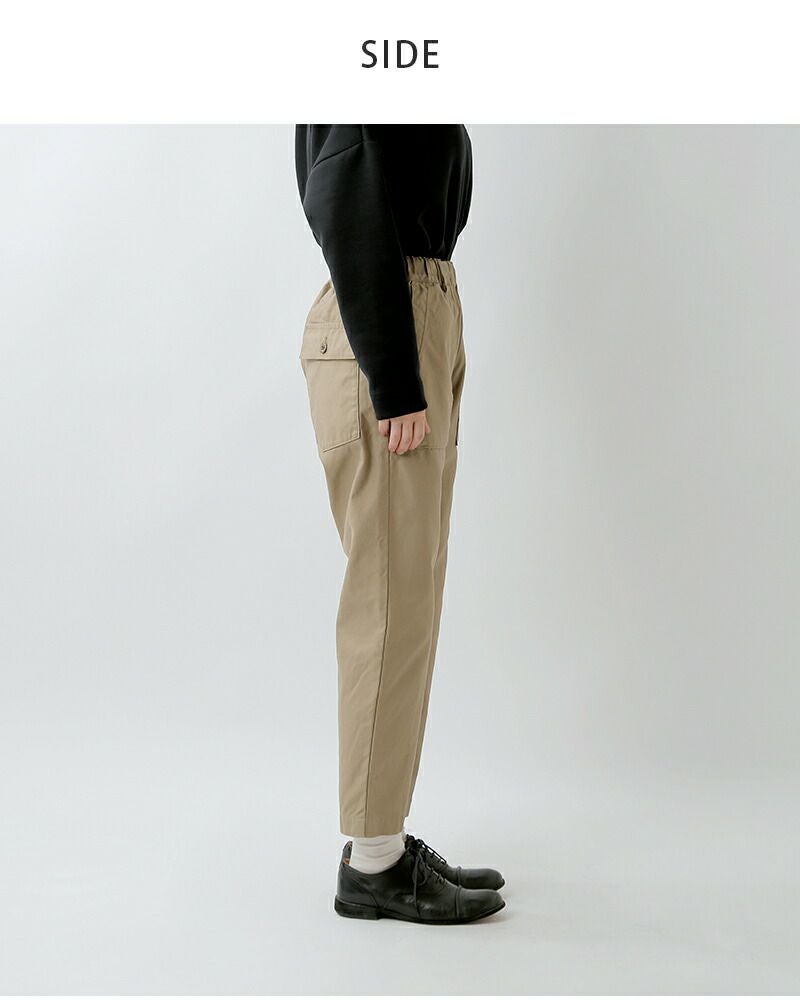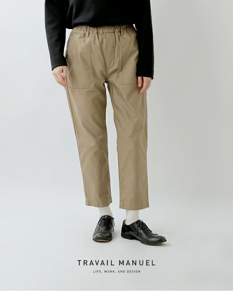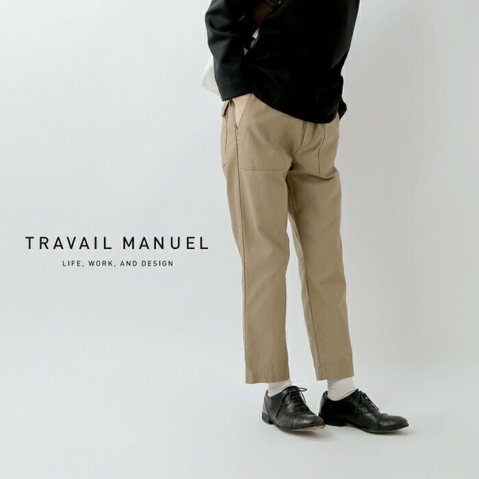 TRAVAIL MANUEL(トラバイユマニュアル)よりバックサテンファティーグパンツのご紹介です。ヒップから太ももにかけて程よいゆとりをもたせ、裾にかけてすっきりと仕上げたテーパードシルエットが魅力のパンツ。シンプルなデザインの中にメンズライクでトラバイユらしいこだわりのスパイスが施され、ワンランク上のアイテムに仕上がっています。少しルーズなシルエットが大人なリラックス感を醸し出し、Tシャツはもちろんレディなアイテムなどとミックスするのもオススメです。