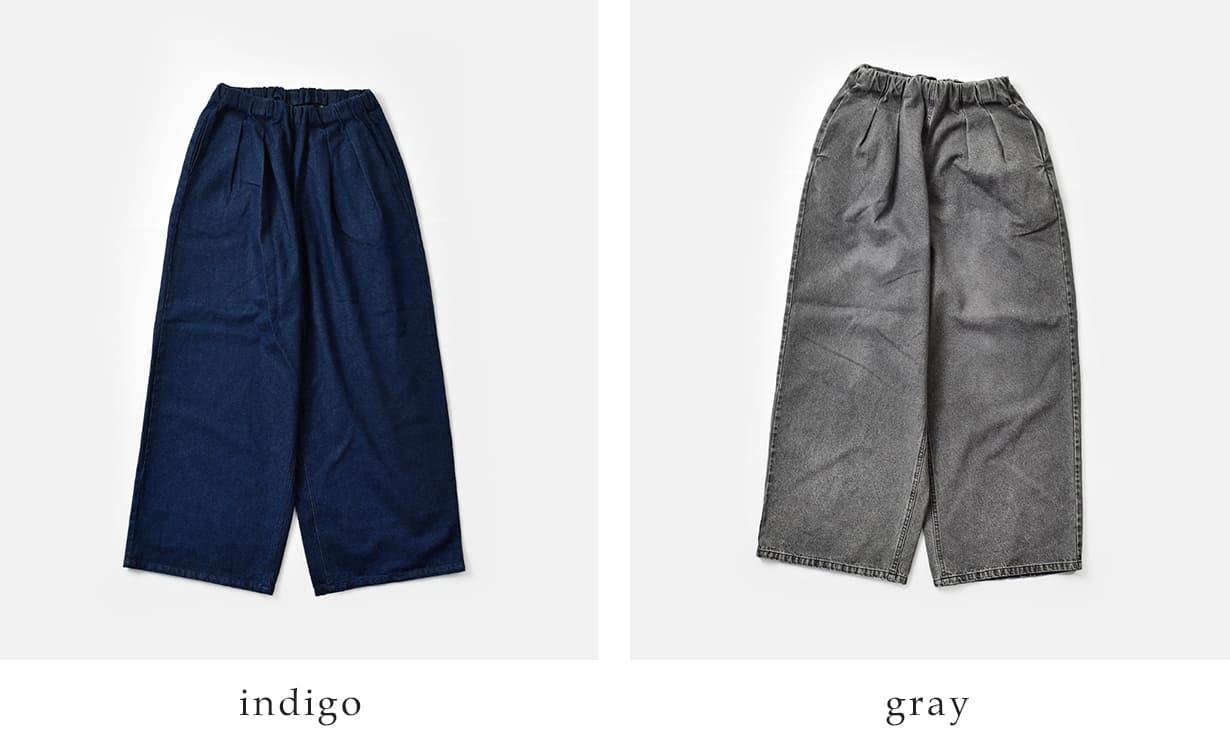 ギャザーとタックによって腰まわりにはゆとりを持たせつつ、縦のラインを強調することでスタイルアップ効果も期待できる一本。ウエストは内側のドロストコードで若干のサイズ調整が可能。インディゴはワンウォッシュ、グレーはケミカルウォッシュ+ブラスト加工を施し、それぞれ異なる表情に仕上げています。