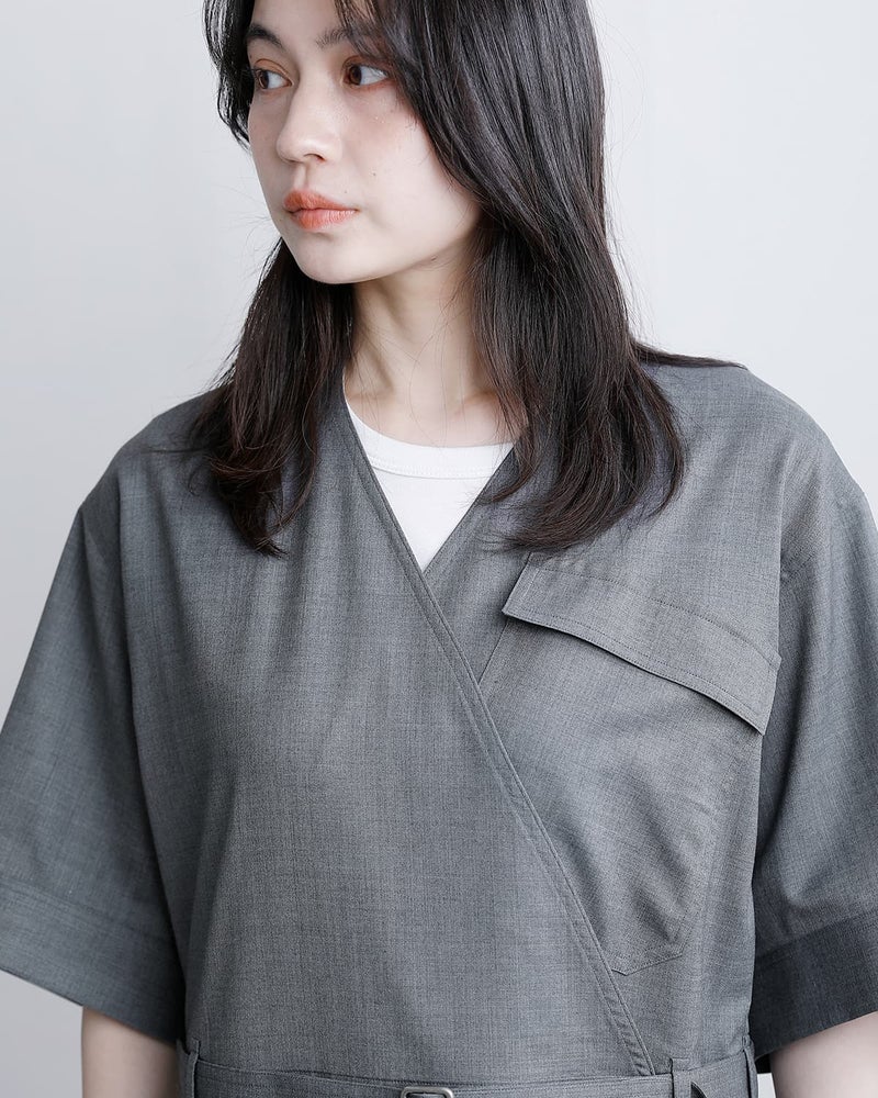 襟はVネックで、すっきりとしたお顔周りを披露します。身頃を重ねた前合わせで、左胸にフラップポケット付きです。