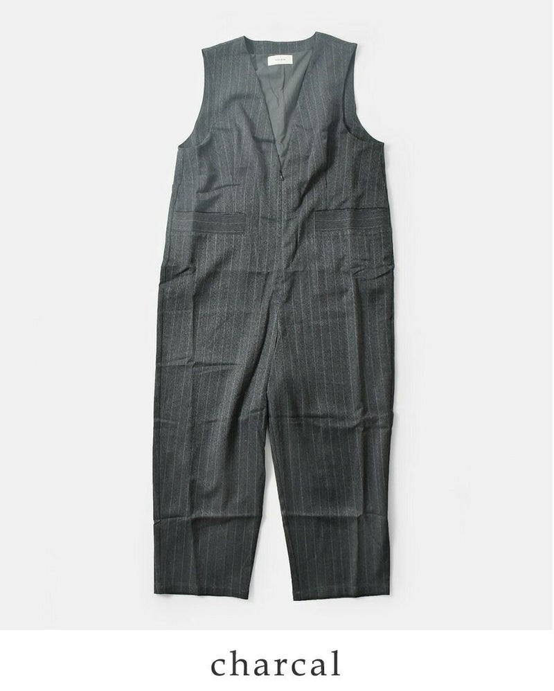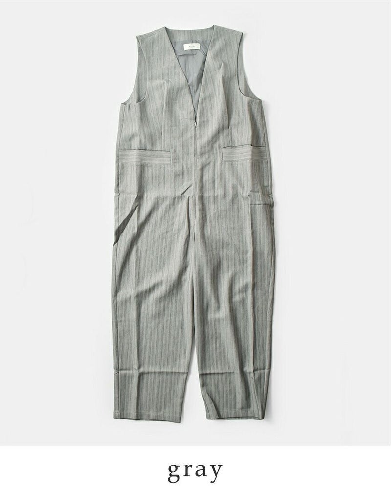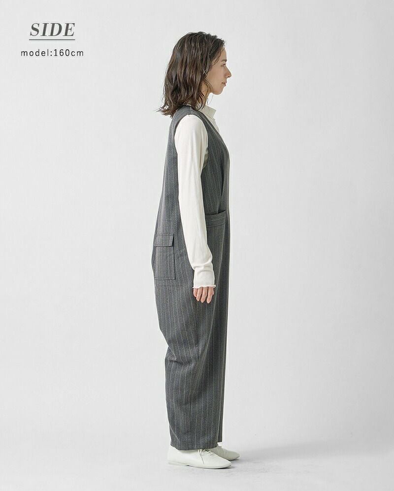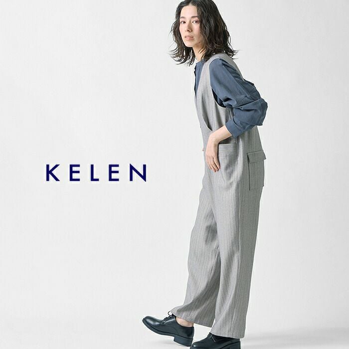 kelen(ケレン)より、ヘリンボーン Vネック サロペット “BRIS”のご紹介です。ピンストライプのスーツ地でサロペットパンツを作りました。深めにとったVネックや程よいテーパードのシルエットがすっきりとした印象を与えてくれます。フロントの大きめのポケットやタックが立体感を生み、腰回りの体のラインを拾わない嬉しいデザイン。ブラウスと合わせるときれいめなスタイリングになり、カットソーなどカジュアルなアイテムを合わせるとこなれたラフなイメージで着用していただけます。