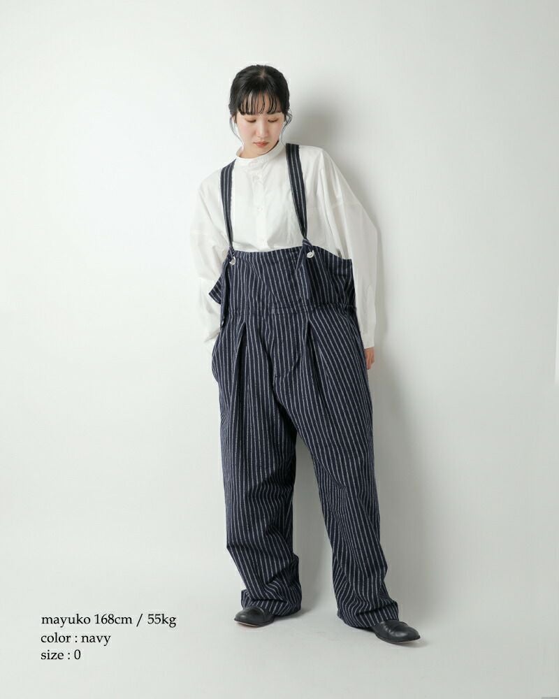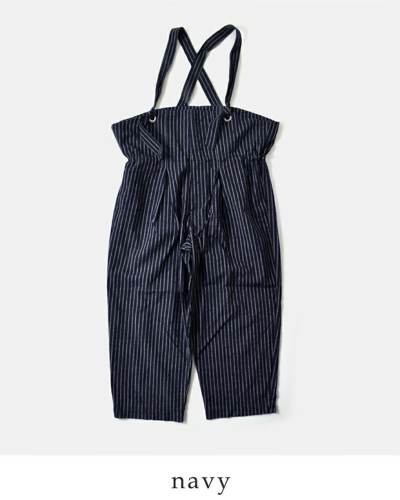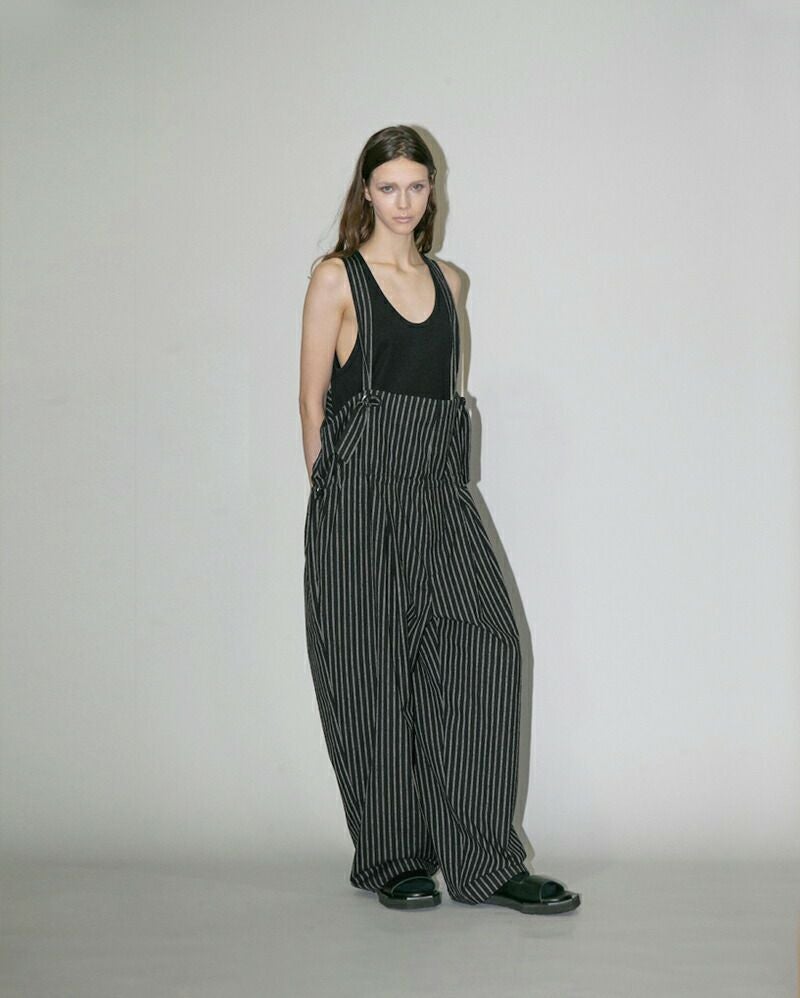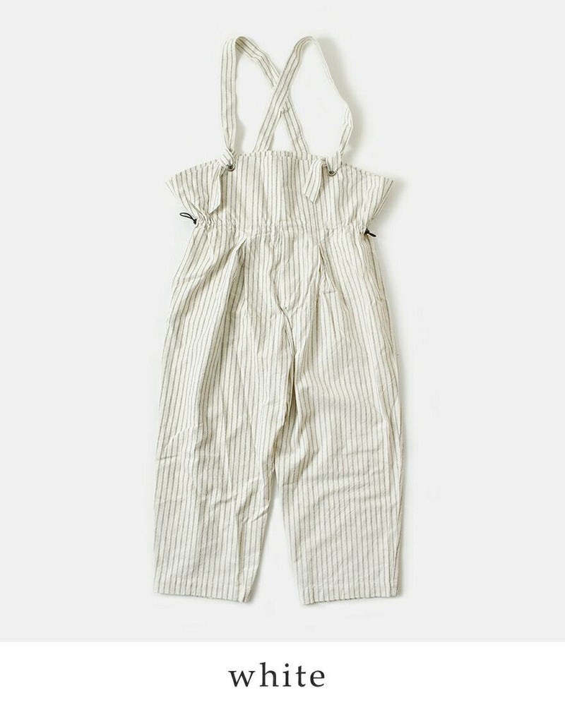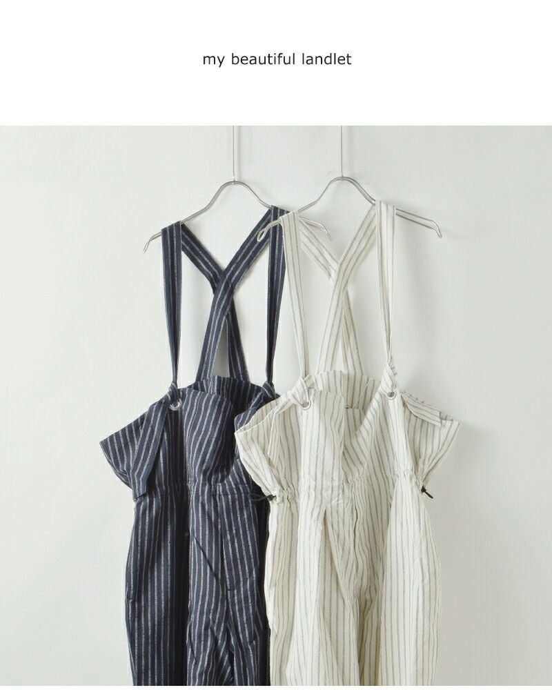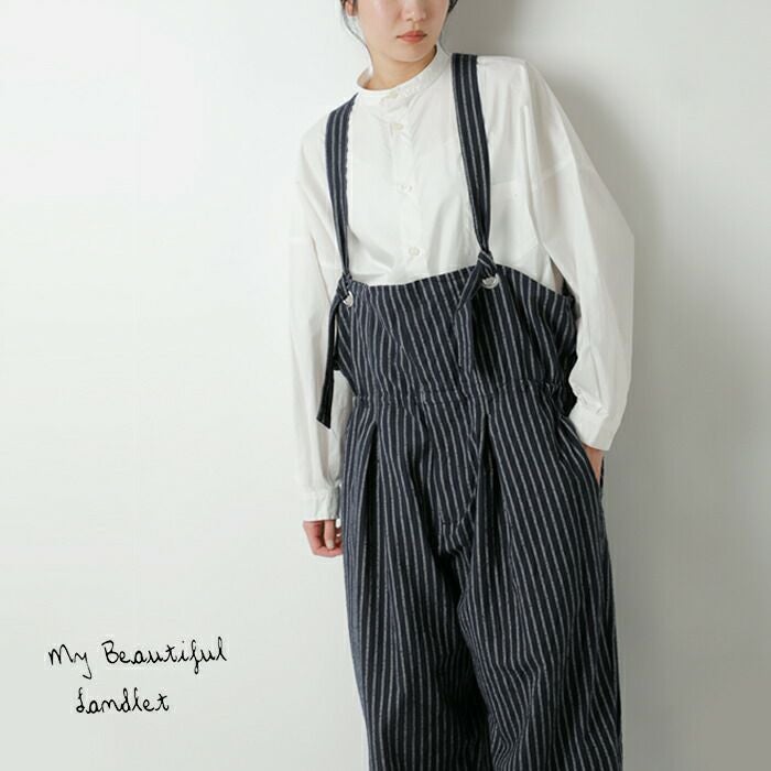 my beautiful landlet(マイ ビューティフル ランドレット)より、素材表情を活かしたデザインが印象的なストライプ カールヤーン サロペットのご紹介をします。カールヤーンを使用したストライプ素材に洗いをかけ、表面に毛足感を持たせたシリーズです。ゆとりを持たせたシルエットは、身体のラインを拾わずリラックスした着心地。インナー次第で雰囲気を変えられ、カットソーやシャツ、タートルネックなど幅広いレイヤードが楽しめます。
