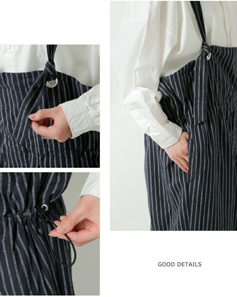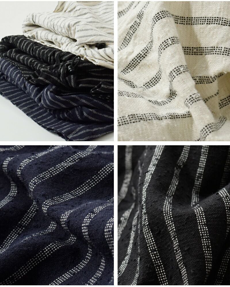 ■綿66%、レーヨン24%、ポリエステル6%、麻4% 表面にループ状の凹凸を持つカールヤーン素材を使用し、立体感のあるストライプ柄に仕上げた生地。奥行きのある表情で、シンプルになりがちなサロペットスタイルに存在感をプラスします。軽やかな生地感で、少しザラザラとした肌触りです。