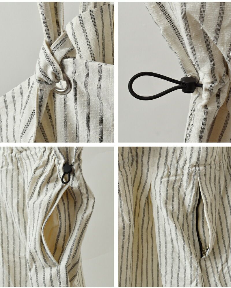 ■ショルダーは結び目で長さ調節が可能。 ■ウエストにはドローコードが入り、フィット感の調節可能。 ■両サイドにはポケットを設置。 ■フロントにはファスナーが設置され、ユニセックスで着用可能なデザインに。